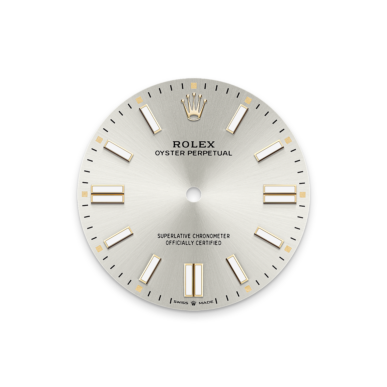 The sunray finish creates delicate light reflections on many dials in the Oyster Perpetual collection. It is obtained using masterful brushing techniques that create grooves running outwards from the centre of the dial.
