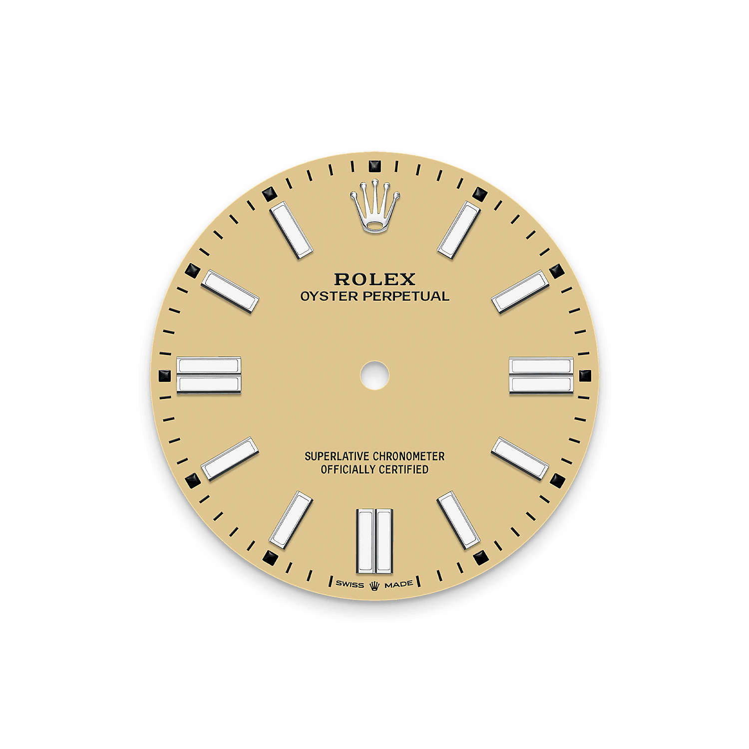 The Oyster Perpetual 41 in Oystersteel with a beige dial and an Oyster bracelet.