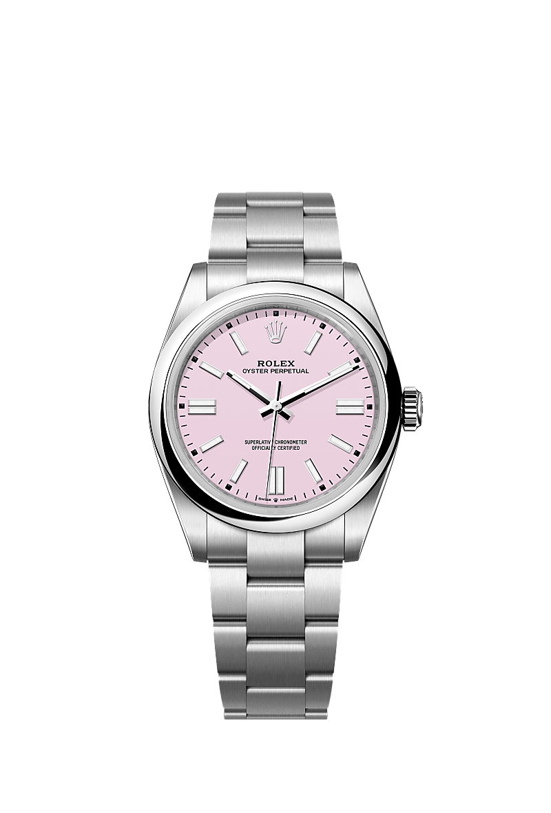 The Oyster Perpetual 41 in Oystersteel with a candy pink dial and an Oyster bracelet.