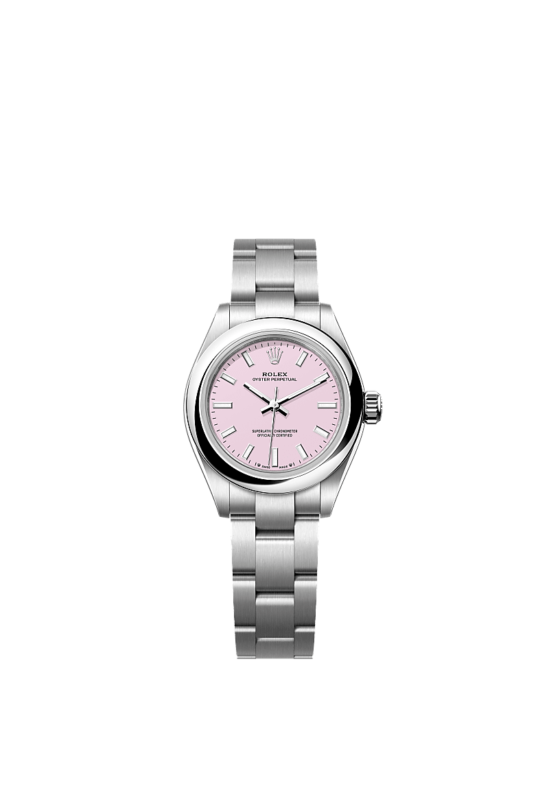 The Oyster Perpetual 28 in Oystersteel with a candy pink dial and an Oyster bracelet.