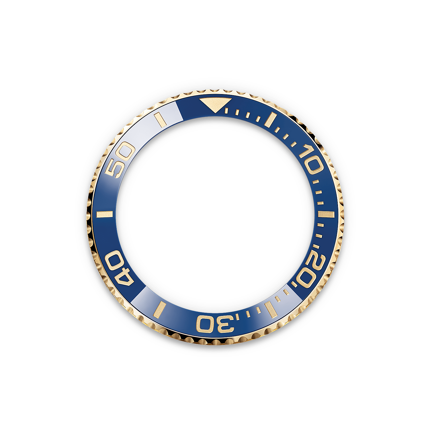 En este disco Cerachrom azul, las graduaciones y los números, moldeados en hueco, se colorean depositando platino u oro amarillo mediante una técnica PVD (Physical Vapour Deposition, depósito físico en fase vapor). La primera mitad de la hora está graduada minuto a minuto. Con el bisel en posición neutra, los últimos 30 segundos de la cuenta atrás se pueden leer con más detalle gracias al segundero central del cronógrafo. El bisel graduado, cuyas muescas del contorno ofrecen un excelente agarre, también permite al usuario medir fácilmente intervalos de tiempo, por ejemplo, el tiempo de navegación entre dos boyas.