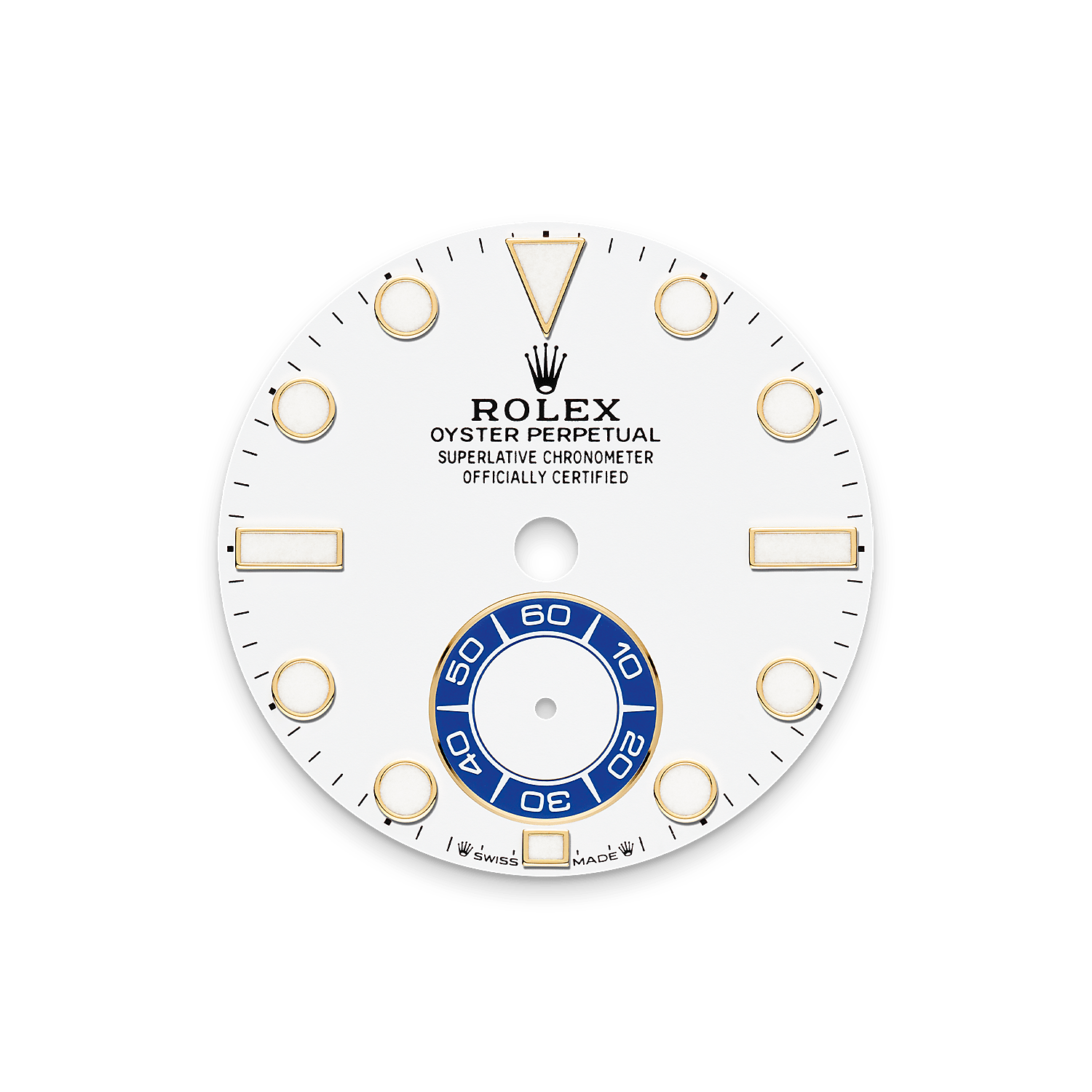 El Yacht-Master II luce un bisel giratorio bidireccional dotado de un disco Cerachrom graduado 60 minutos en cerámica azul. Extremadamente dura y prácticamente imposible de rayar, la cerámica de alta tecnología utilizada por Rolex requiere herramientas especiales para su mecanizado. Su color estable no se ve alterado por los efectos de los rayos ultravioleta y, gracias a su composición química, esta cerámica es inerte y no se puede corroer.