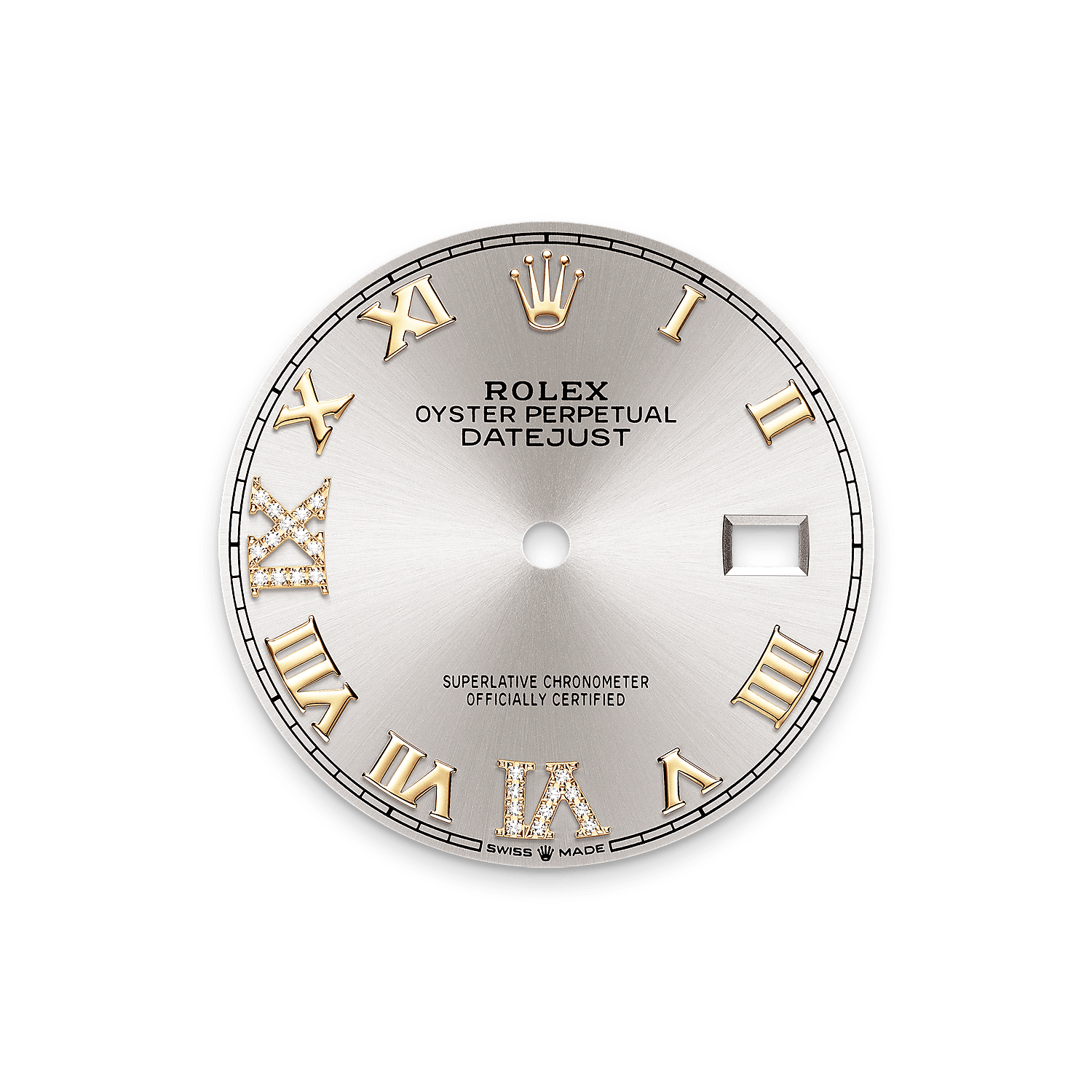 Esta esfera presenta números romanos VI y IX en oro de 18 quilates engastados de 24 diamantes. El acabado tipo sol crea delicados reflejos de luz en muchas esferas de la colección Oyster Perpetual. Se obtiene utilizando técnicas magistrales de cepillado que crean surcos que salen del centro de la esfera.