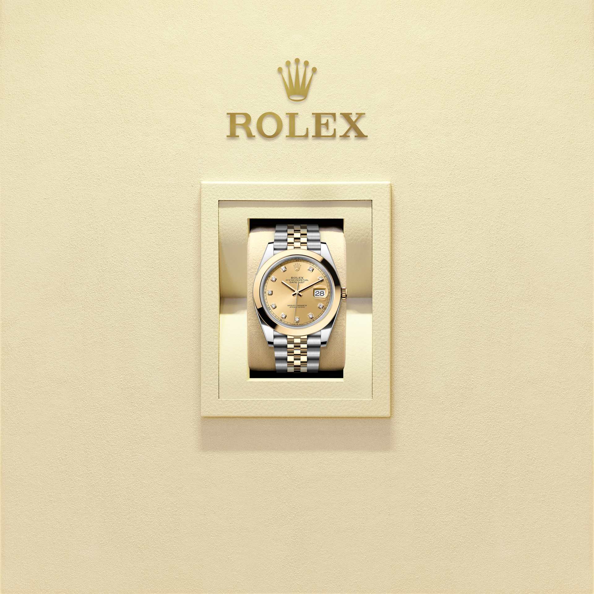 Este Oyster Perpetual Datejust 41 en acero Oystersteel y oro amarillo presenta una esfera color champagne, engastada de diamantes y un brazalete Jubilee.