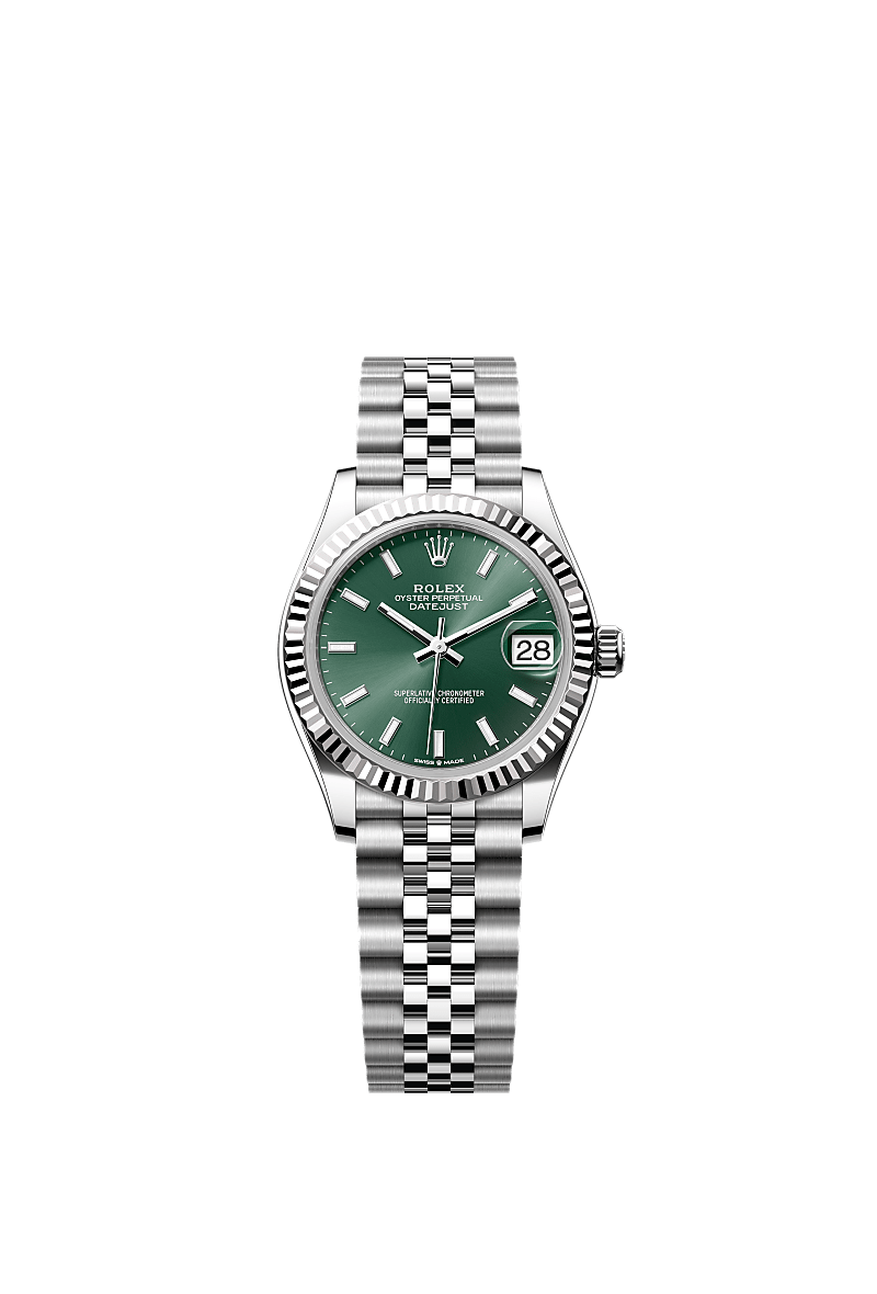 Este Oyster Perpetual Datejust 31 en acero Oystersteel y oro blanco presenta una esfera verde menta y un brazalete Jubilee.