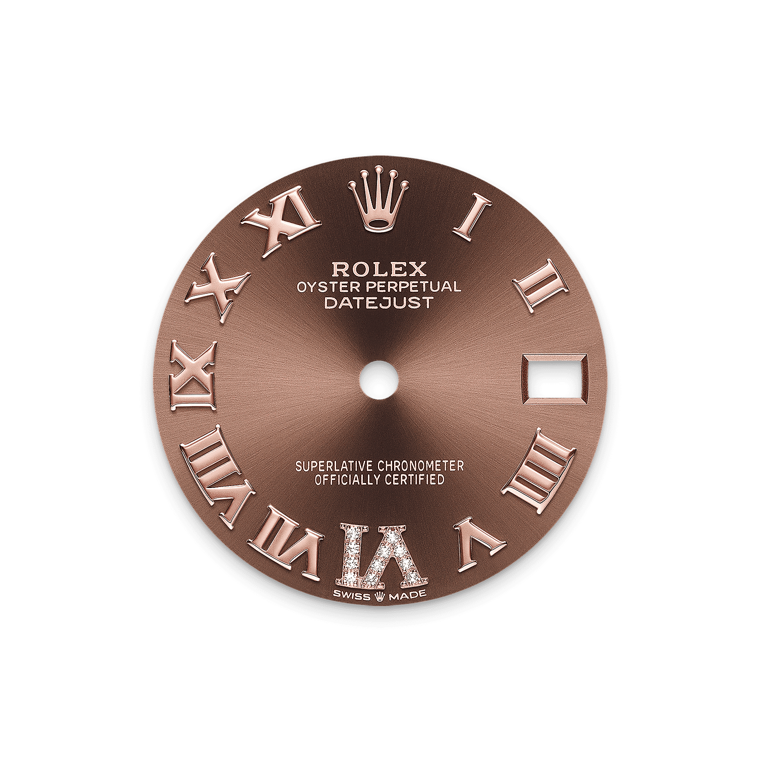 Esta esfera presenta un gran VI engastado de 11 diamantes. El acabado tipo sol crea delicados reflejos de luz en muchas esferas de la colección Oyster Perpetual. Se obtiene utilizando técnicas magistrales de cepillado que crean surcos que salen del centro de la esfera.