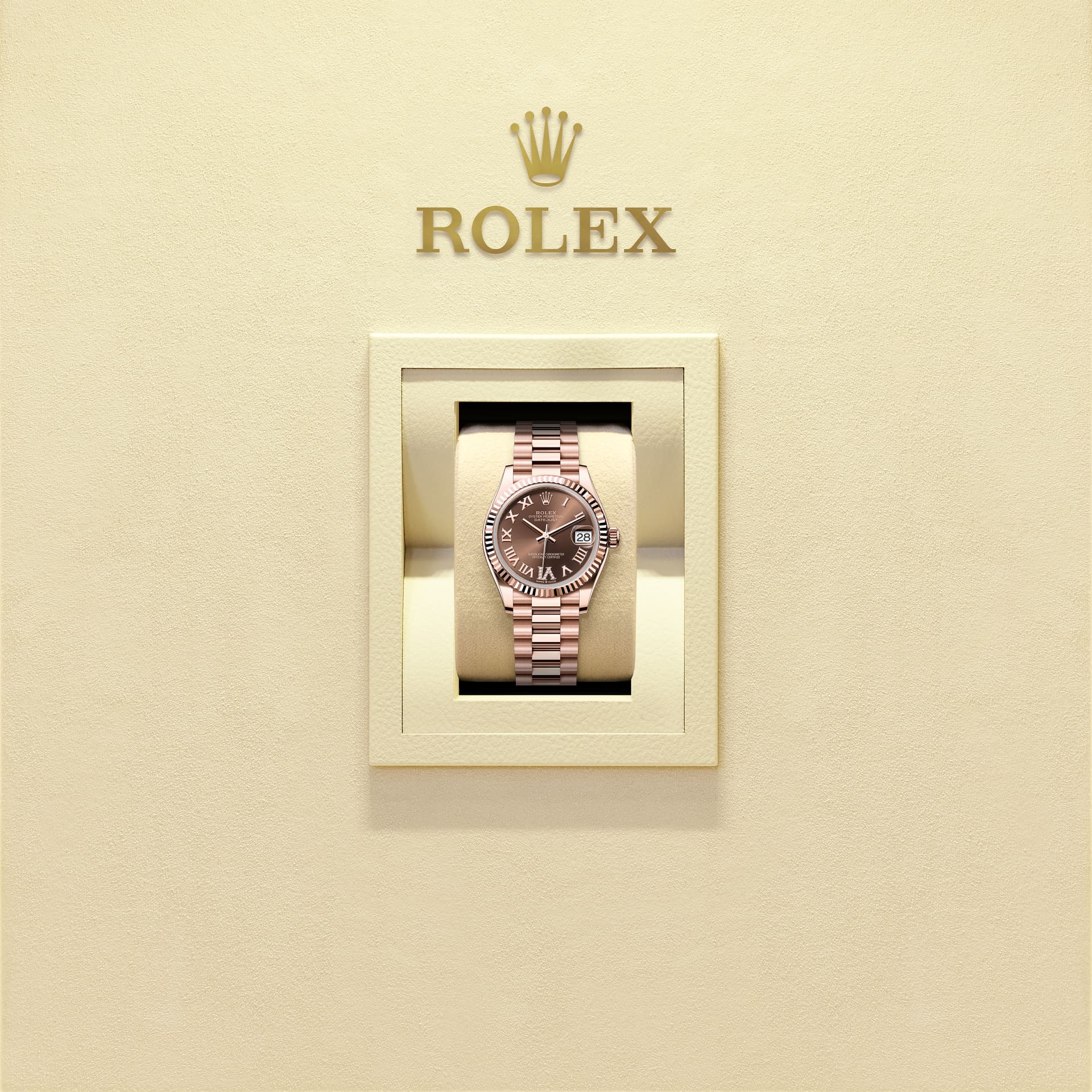 Este Oyster Perpetual Datejust 31 en oro Everose de 18 quilates presenta una esfera chocolate, engastada de diamantes y un brazalete President.