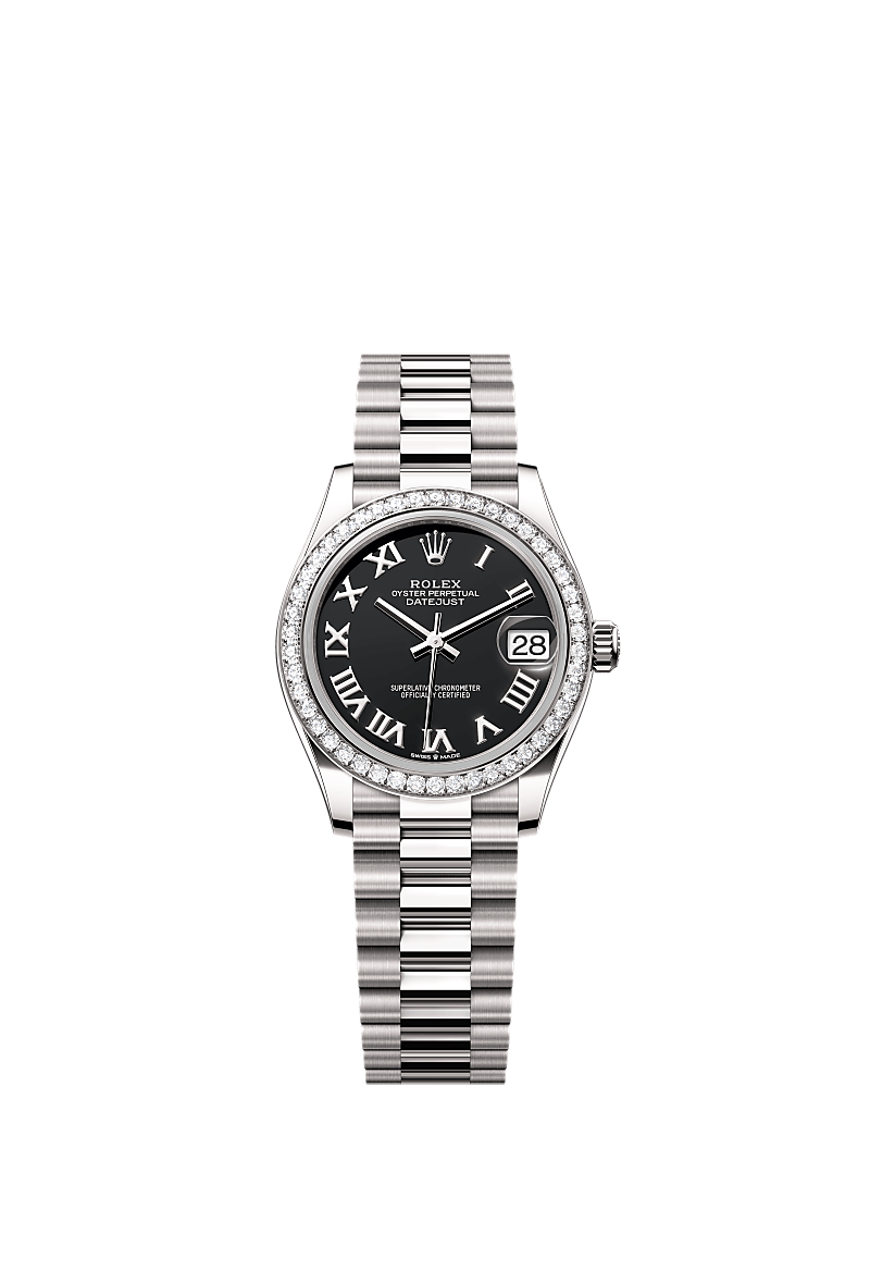 Este Oyster Perpetual Datejust 31 en oro blanco de 18 quilates presenta una esfera negro vivo y un brazalete President.