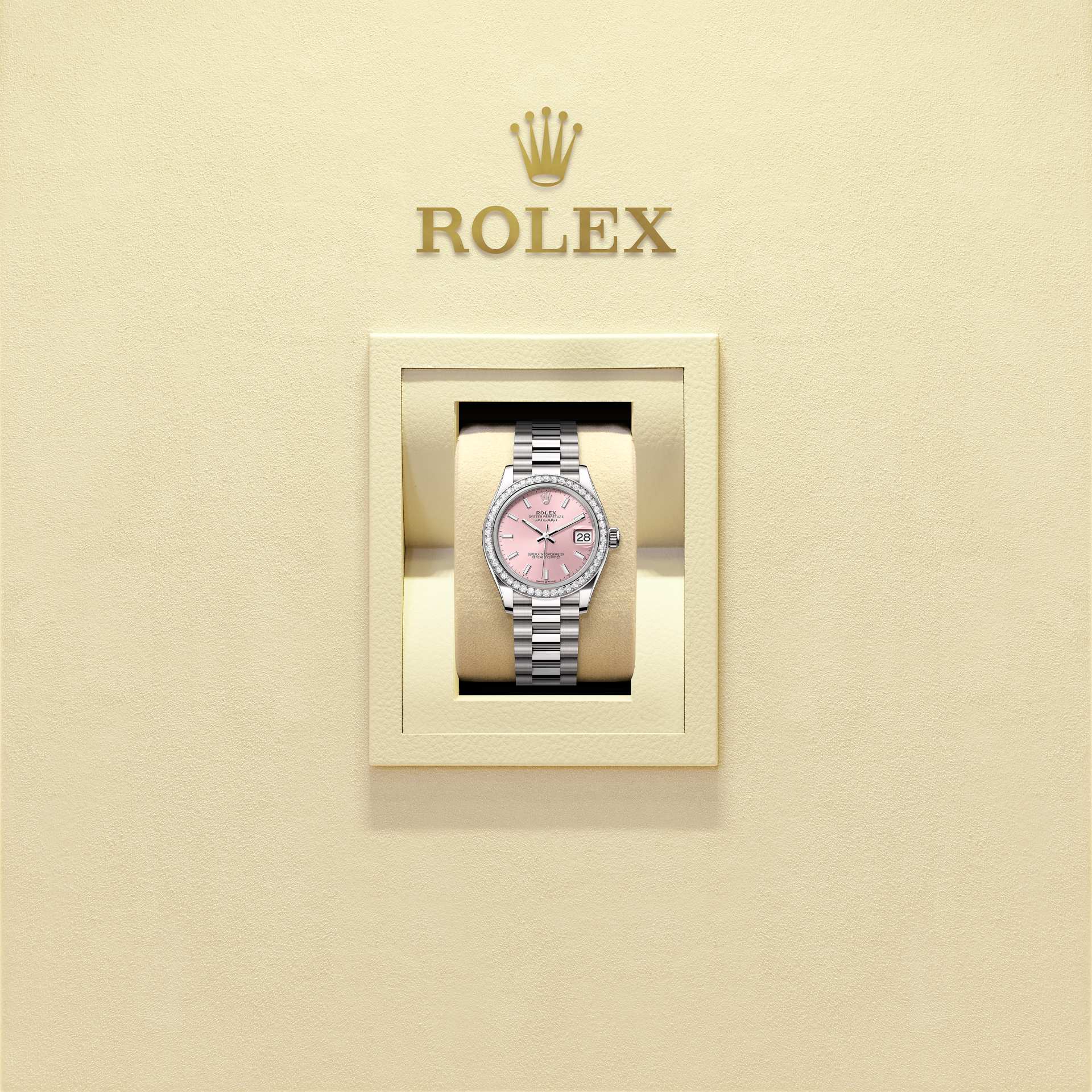 Este Oyster Perpetual Datejust 31 en oro blanco de 18 quilates presenta una esfera rosa y un brazalete President.
