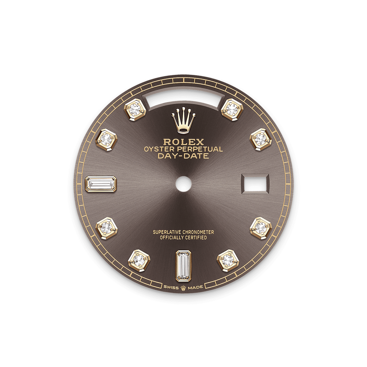 Esta esfera presenta chatones en oro de 18 quilates con diamantes engastados y diamantes talla baguette a las 6 h y a las 9 h. El acabado tipo sol crea delicados reflejos de luz en muchas esferas de la colección Oyster Perpetual. Se obtiene utilizando técnicas magistrales de cepillado que crean surcos que salen del centro de la esfera.