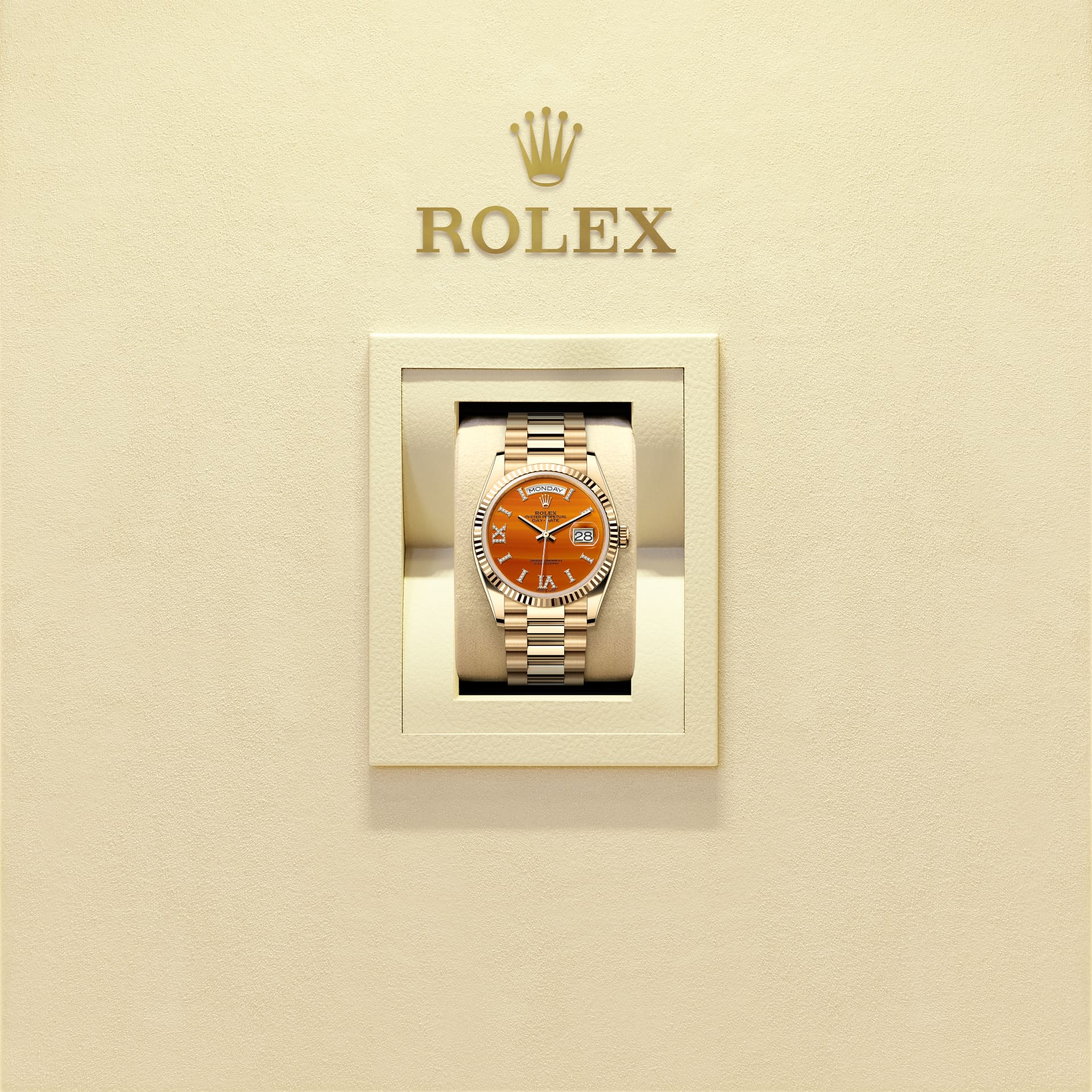 Oyster Perpetual Day-Date 36 en oro amarillo de 18 quilates con esfera cornalina, engastada de diamantes, bisel estriado y brazalete President.