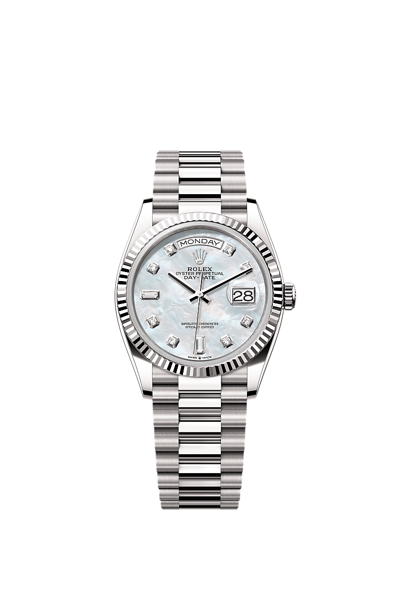 Oyster Perpetual Day-Date 36 en oro blanco de 18 quilates con esfera nácar blanco, engastada de diamantes, bisel estriado y brazalete President.