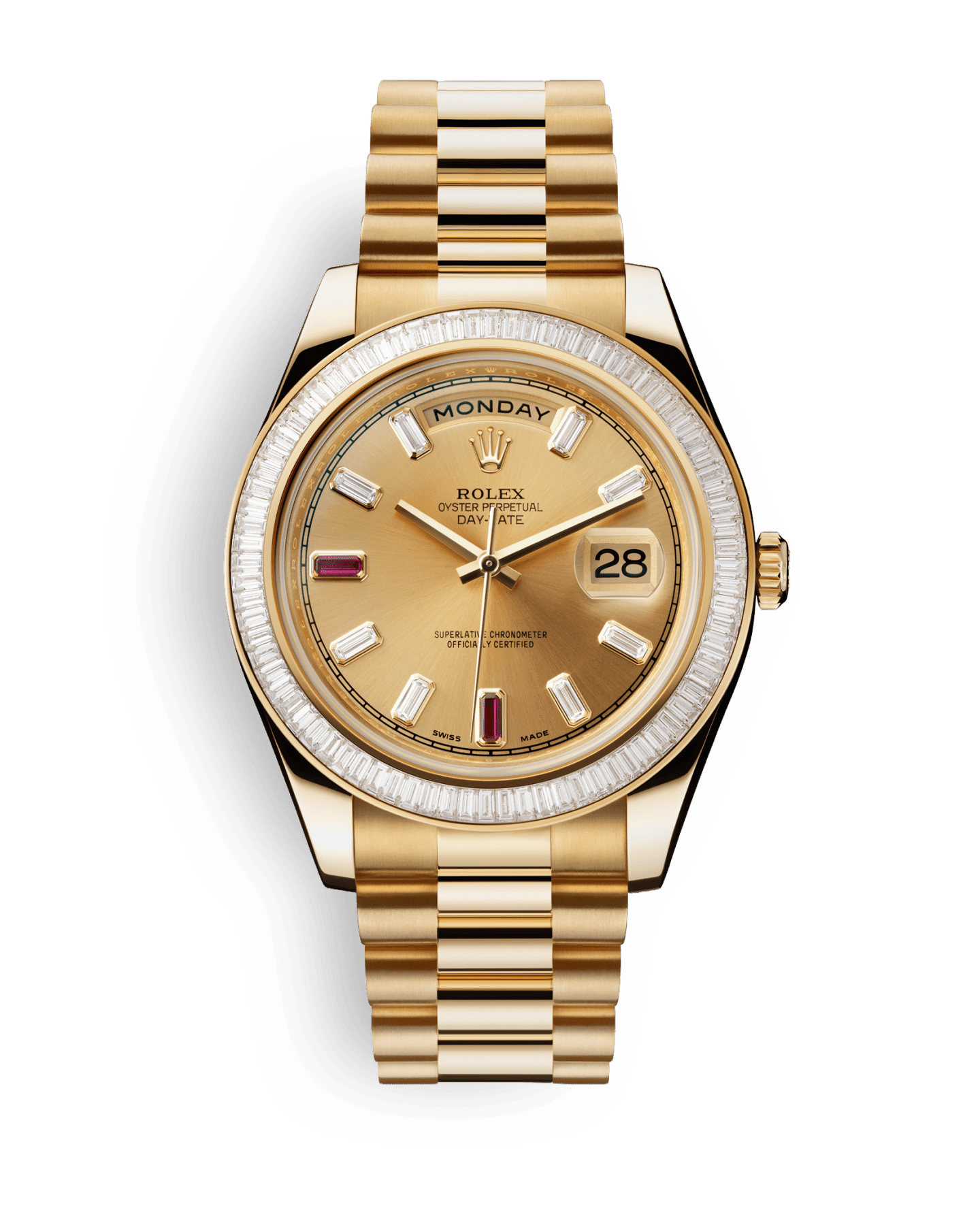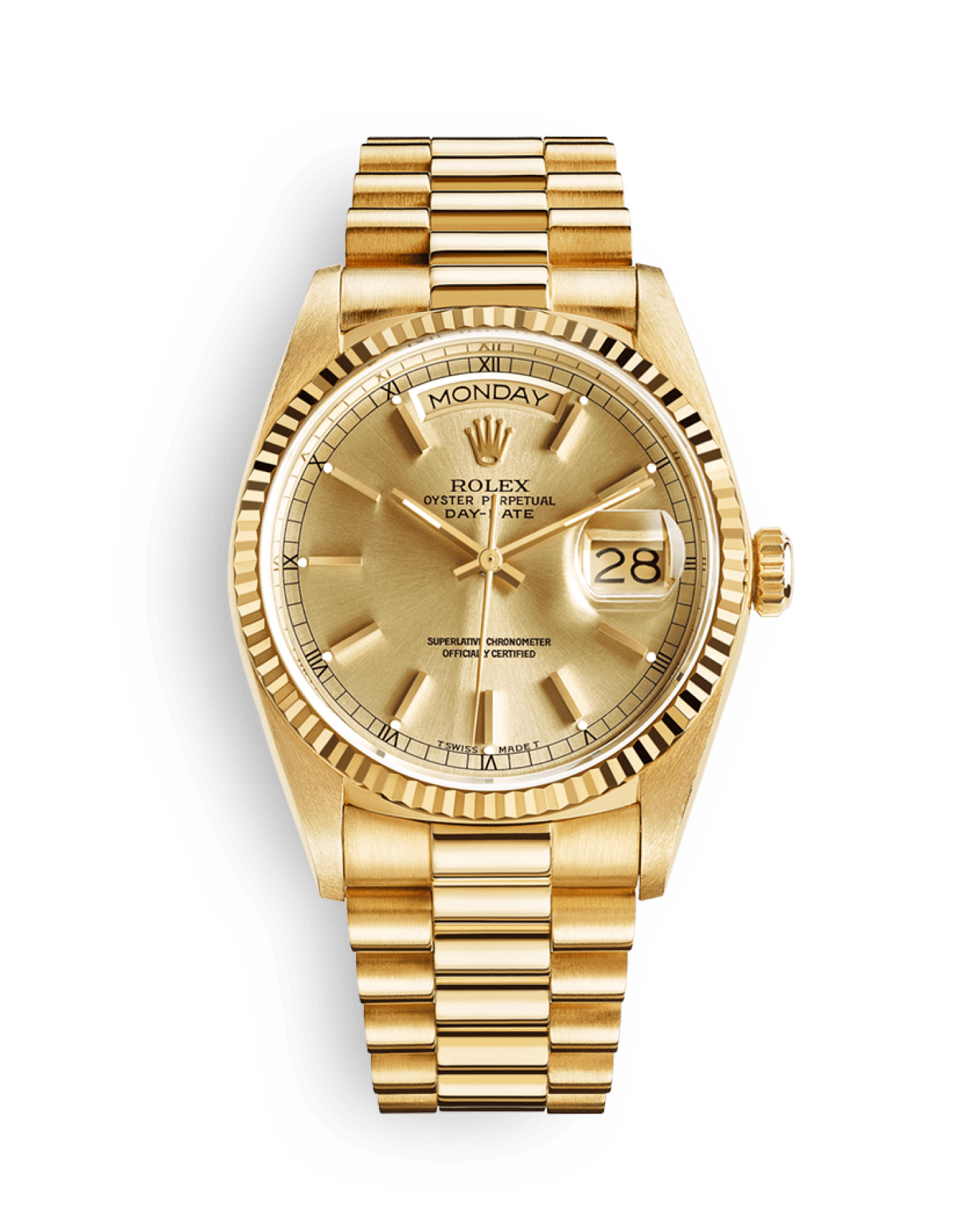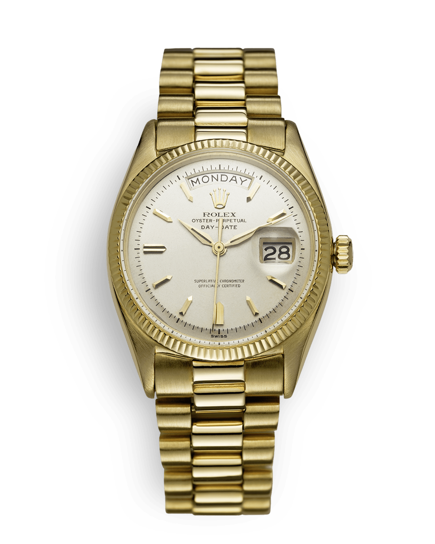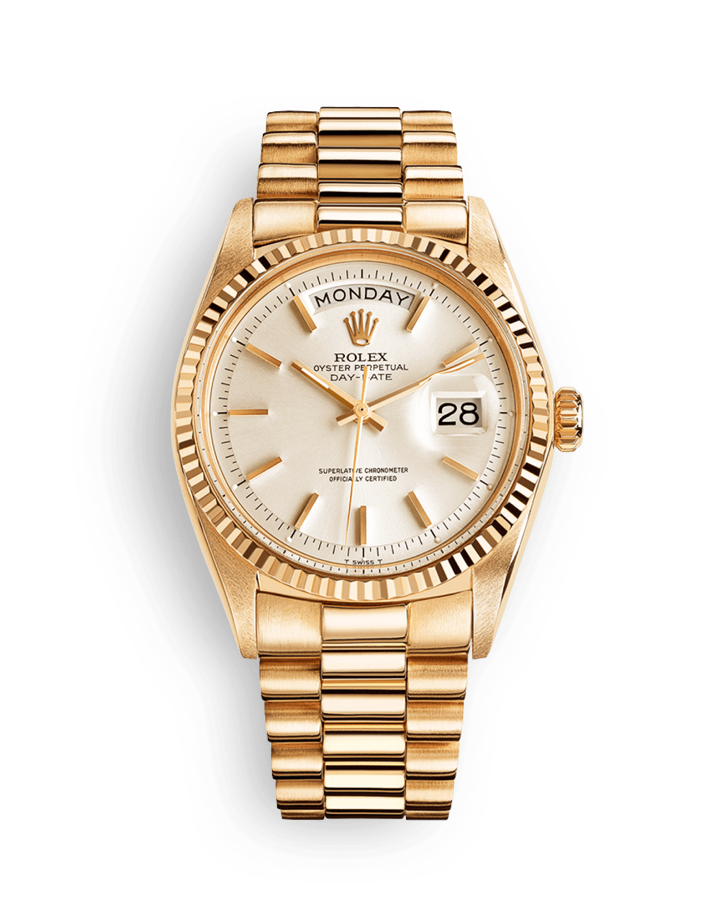 El Day-Date es un reloj de pulsera con calendario que indica tanto la fecha como el día de la semana con todas las letras. Desde su lanzamiento, ha acompañado a personalidades poderosas e influyentes, como se expresa en el eslogan: los que han marcado el destino del mundo lucen relojes Rolex. El Day-Date se convirtió rápidamente en un símbolo universal de prestigio y liderazgo.