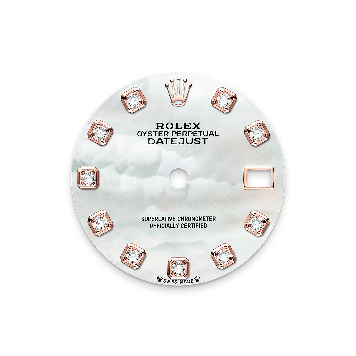 En Rolex, el nácar nunca se colorea de forma artificial. Sencillamente destacamos su belleza natural y preservamos sus colores naturales gracias a un savoir‑faire particular y una gran habilidad. Las esferas de nácar son piezas únicas, por lo que nunca encontrará una igual a la suya en otra muñeca.