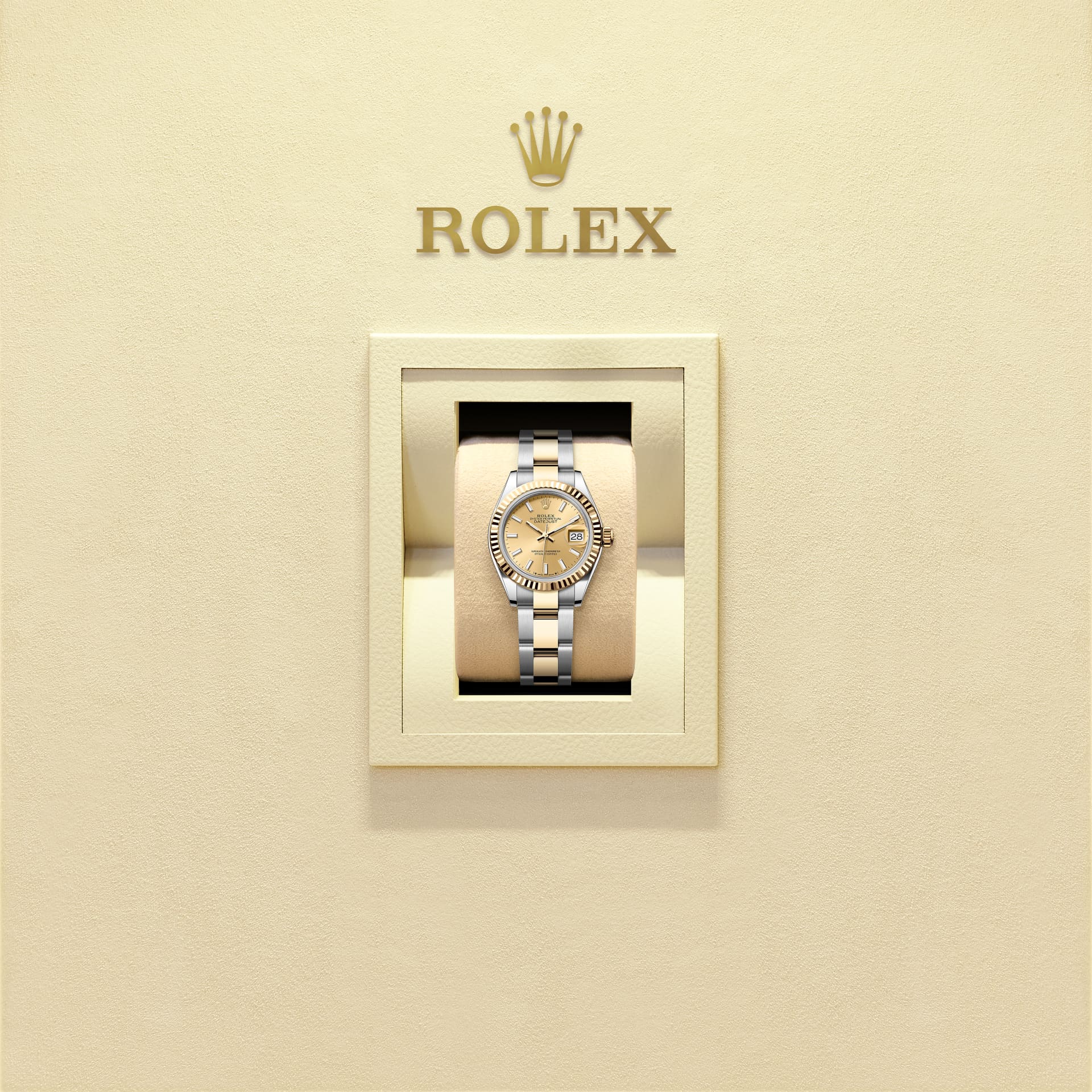 Este Oyster Perpetual Lady-Datejust en acero Oystersteel y oro amarillo presenta una esfera color champagne y un brazalete Oyster.