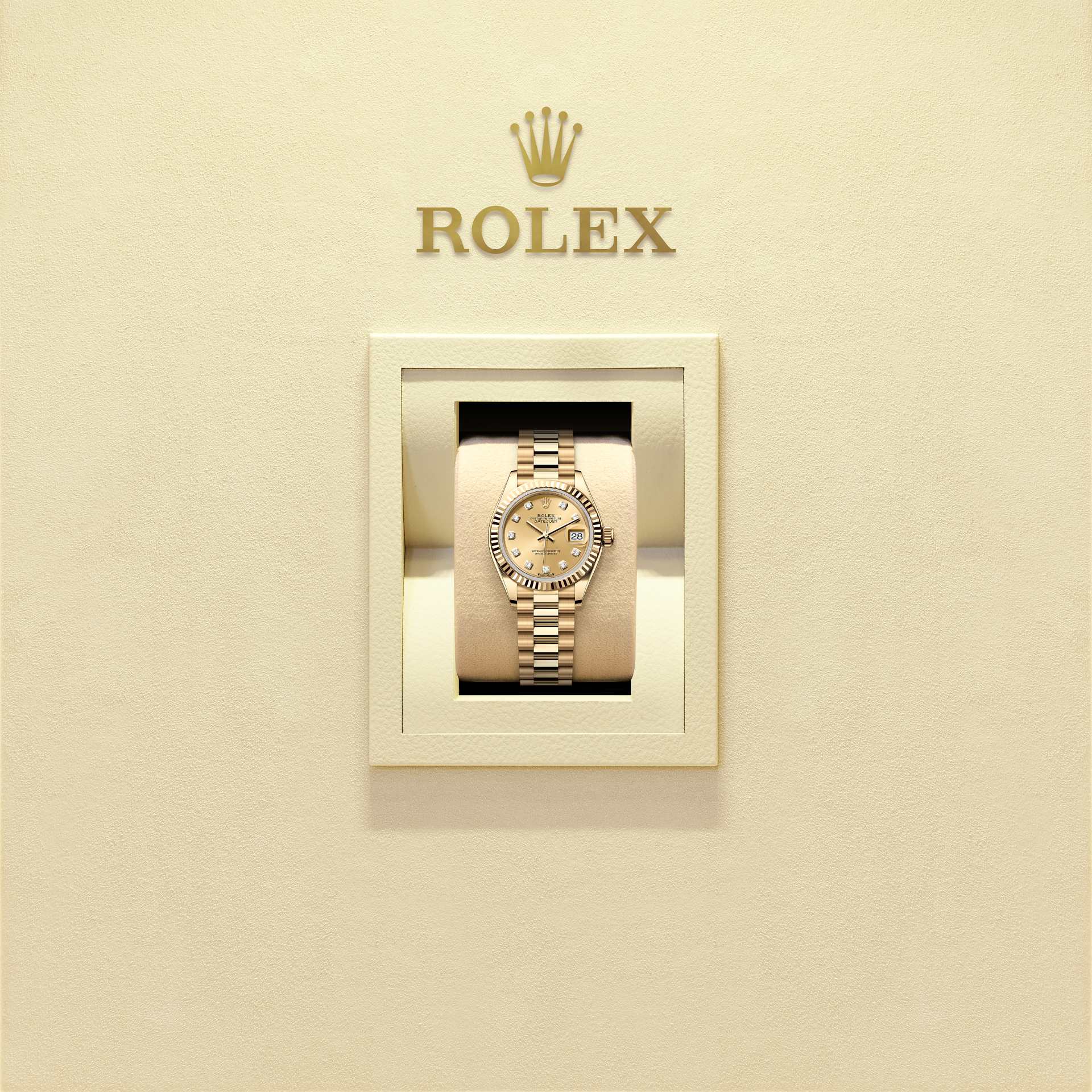 Este Oyster Perpetual Lady-Datejust en oro amarillo de 18 quilates presenta una esfera color champagne, engastada de diamantes y un brazalete President.