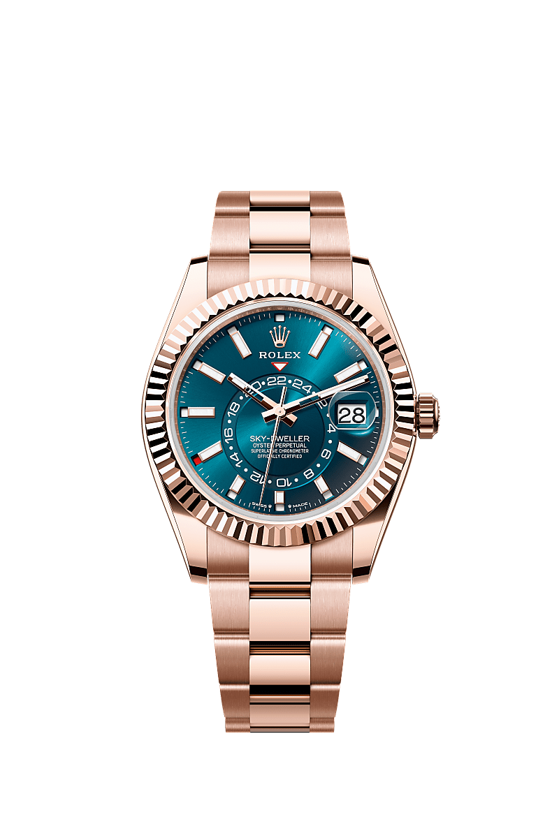 Oyster Perpetual Sky-Dweller en oro Everose de 18 quilates, con esfera azul-verde y brazalete Oyster.