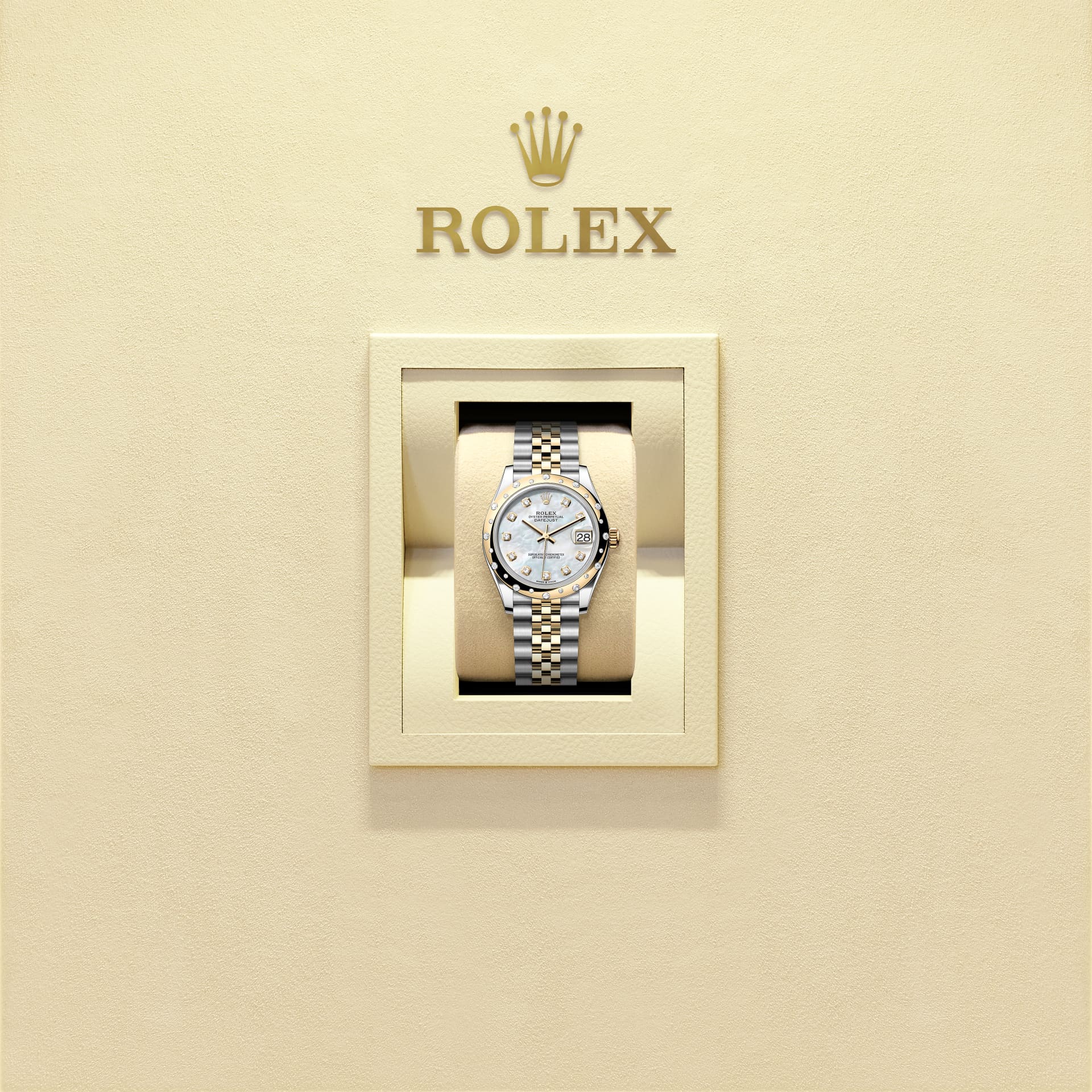 ساعت Oyster Perpetual Datejust 31 از جنس اویستراستیل و طلای زرد مجهز به صفحه صدفی سفید، الماسنشان و بند جوبیلی (Jubilee) است.