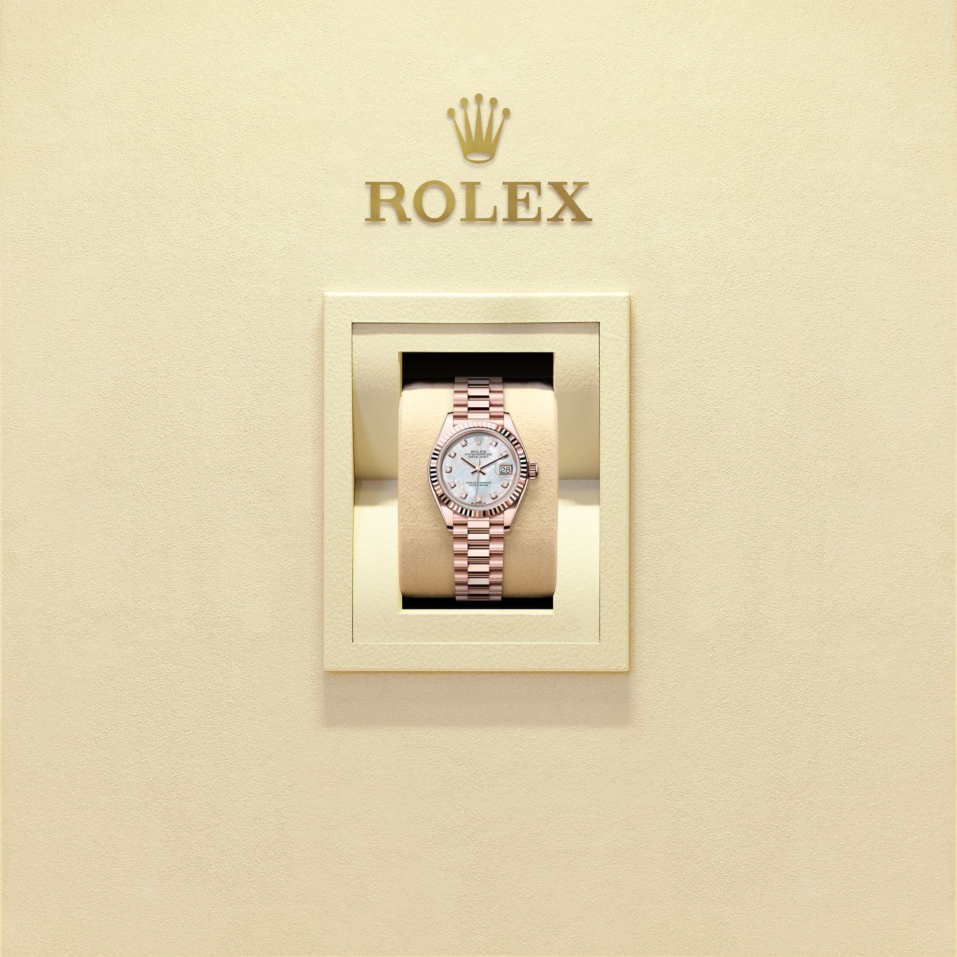 ساعت Oyster Perpetual Lady-Datejust از جنس طلای اِوررُز ۱۸ عیار مجهز به صفحه صدفی سفید، الماسنشان و بند پرزیدنت (President) است.