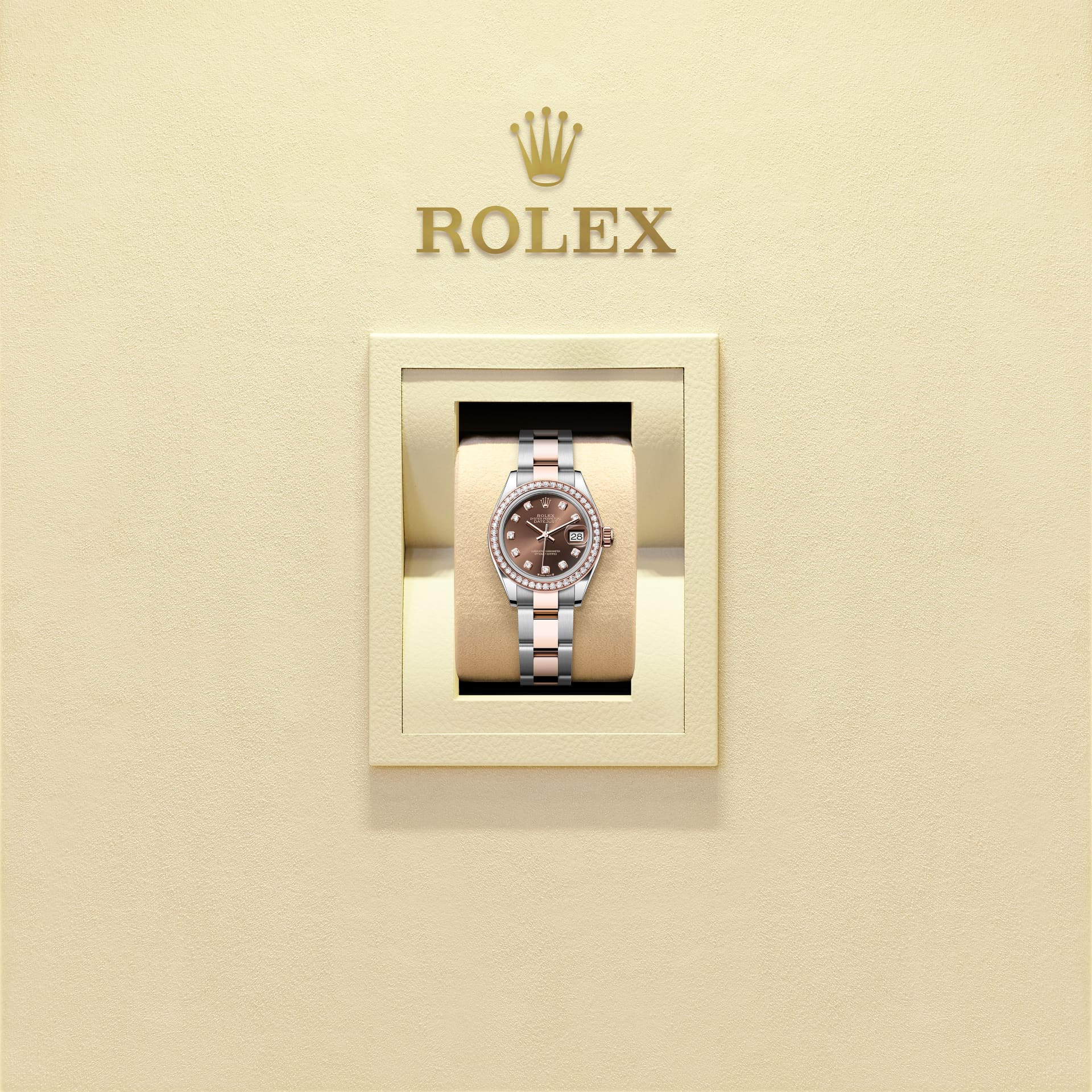 ساعت Oyster Perpetual Lady-Datejust از جنس اویستراستیل و طلای اِوررُز مجهز به صفحه شکلاتی، الماسنشان و بند اویستر است.