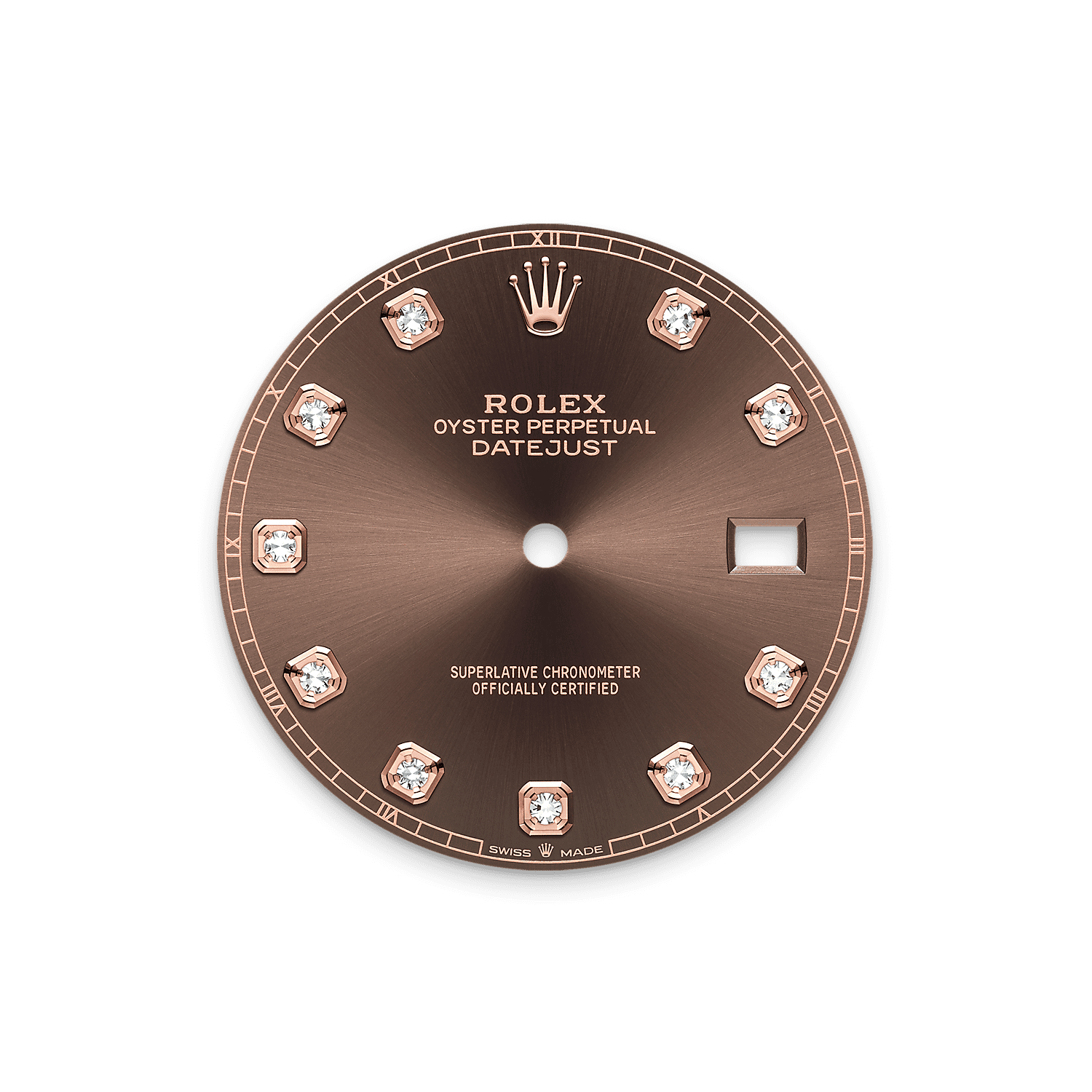 Ce cadran est doté de diamants sertis dans des chatons en or 18 ct. La finition soleil permet d’obtenir des reflets ondoyants sur de nombreux cadrans de la collection Oyster Perpetual. Créée par un brossage circulaire continu parfaitement maîtrisé, elle présente des stries allant du centre du cadran vers l’extérieur.