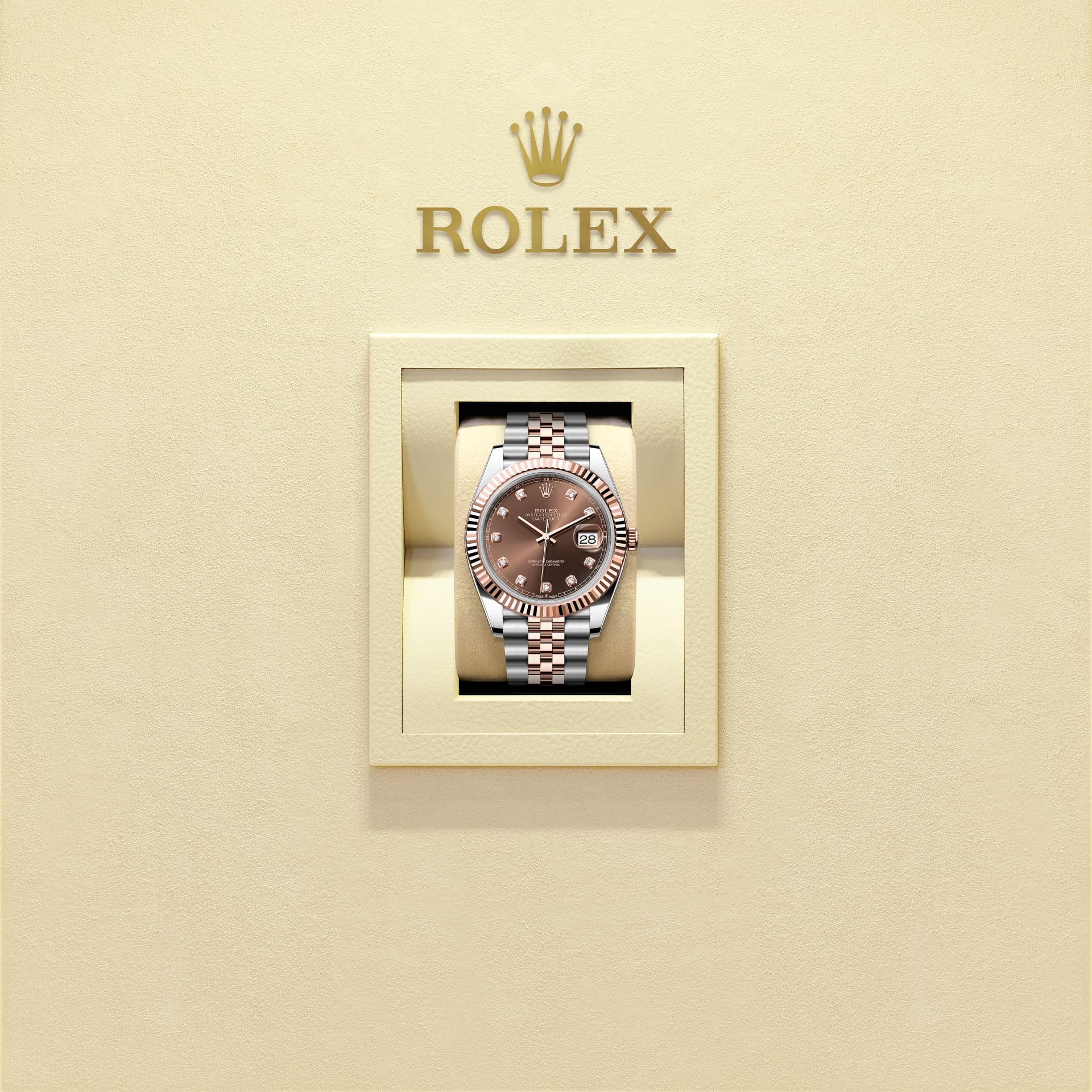 Cette Oyster Perpetual Datejust 41 en acier Oystersteel et or Everose est dotée d’un cadran chocolat, serti de diamants et d’un bracelet Jubilee.