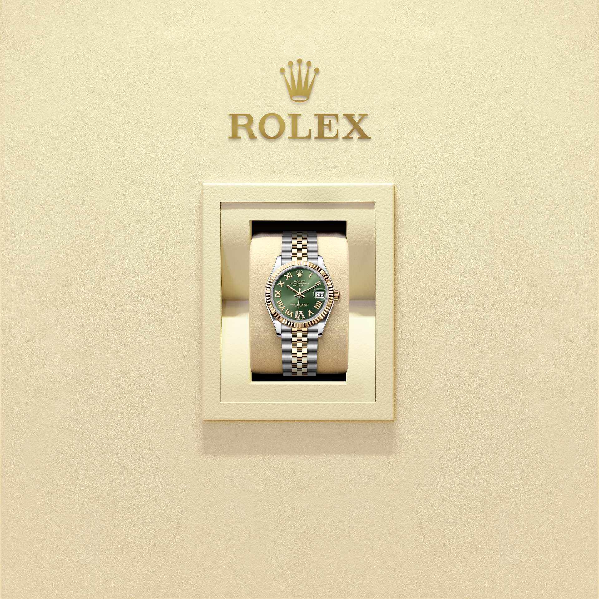 Cette Oyster Perpetual Datejust 31 en acier Oystersteel et or jaune est dotée d’un cadran vert olive, serti de diamants et d’un bracelet Jubilee.