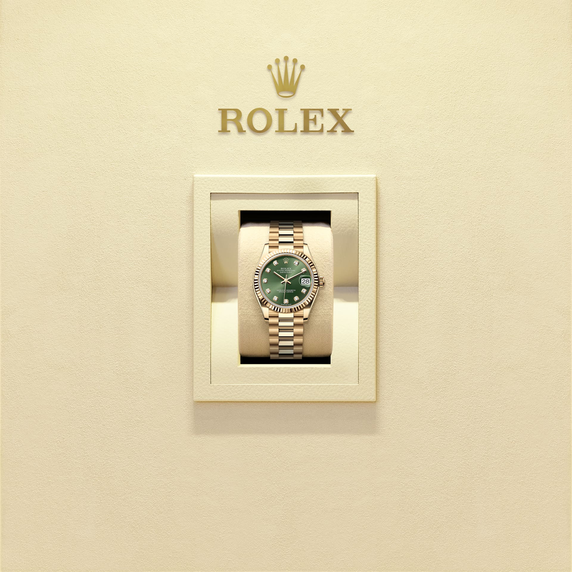 Cette Oyster Perpetual Datejust 31 en or jaune 18 ct est dotée d’un cadran vert olive, serti de diamants et d’un bracelet President.