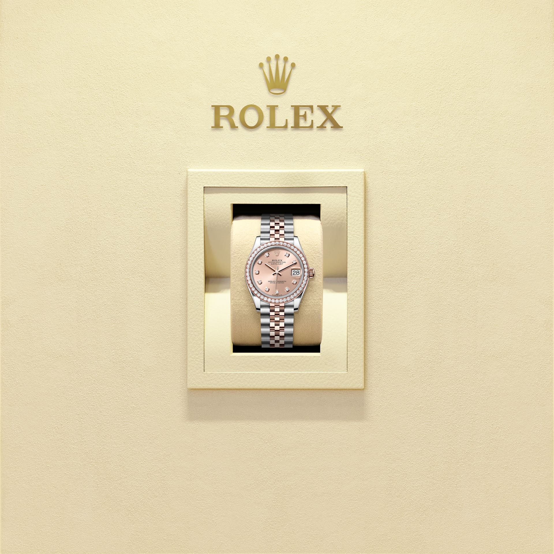 Cette Oyster Perpetual Datejust 31 en acier Oystersteel et or Everose est dotée d’un cadran couleur rosé, serti de diamants et d’un bracelet Jubilee.
