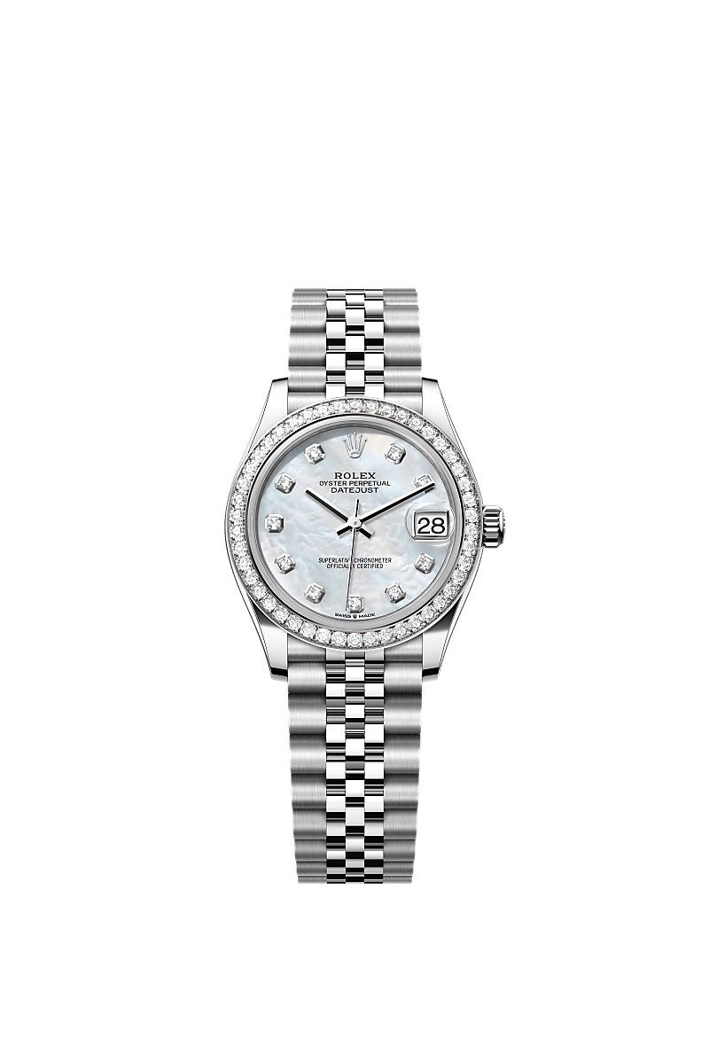 Cette Oyster Perpetual Datejust 31 en acier Oystersteel et or gris est dotée d’un cadran en nacre blanche serti de diamants et d’un bracelet Jubilee.