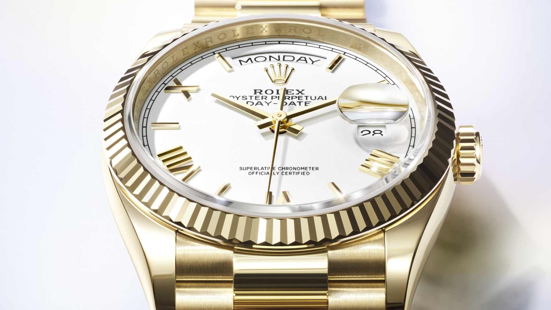 De plus, elles étaient identiques aux cannelures présentes sur le fond de boîtier, lui aussi vissé sur le boîtier pour la même raison, au moyen d’outils Rolex spécifiques. Avec le temps, les cannelures sont devenues un élément purement esthétique, la signature de Rolex. Aujourd'hui la lunette cannelée est un élément signature, en or sur cette Day-Date 36.