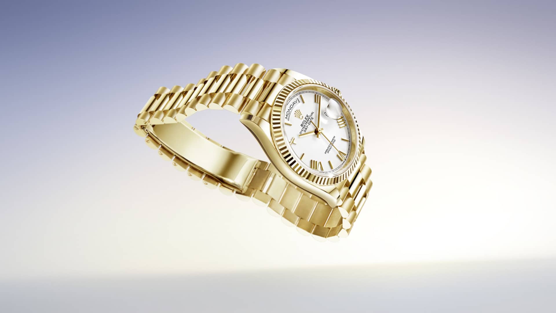 L’Oyster Perpetual Day-Date 36 en or jaune 18 ct dotée d’un cadran blanc, d’une lunette cannelée et d’un bracelet President.