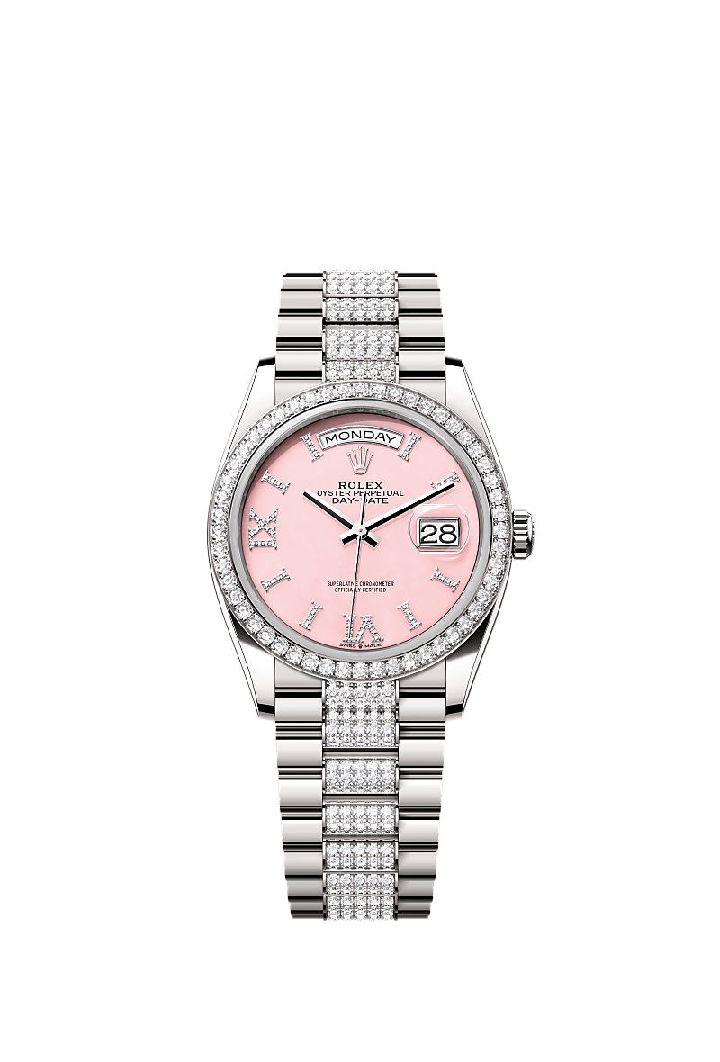 L’Oyster Perpetual Day-Date 36 en or gris 18 ct est dotée d’un cadran en opale rose serti de diamants, d’une lunette sertie de diamants et d’un bracelet President serti de diamants.