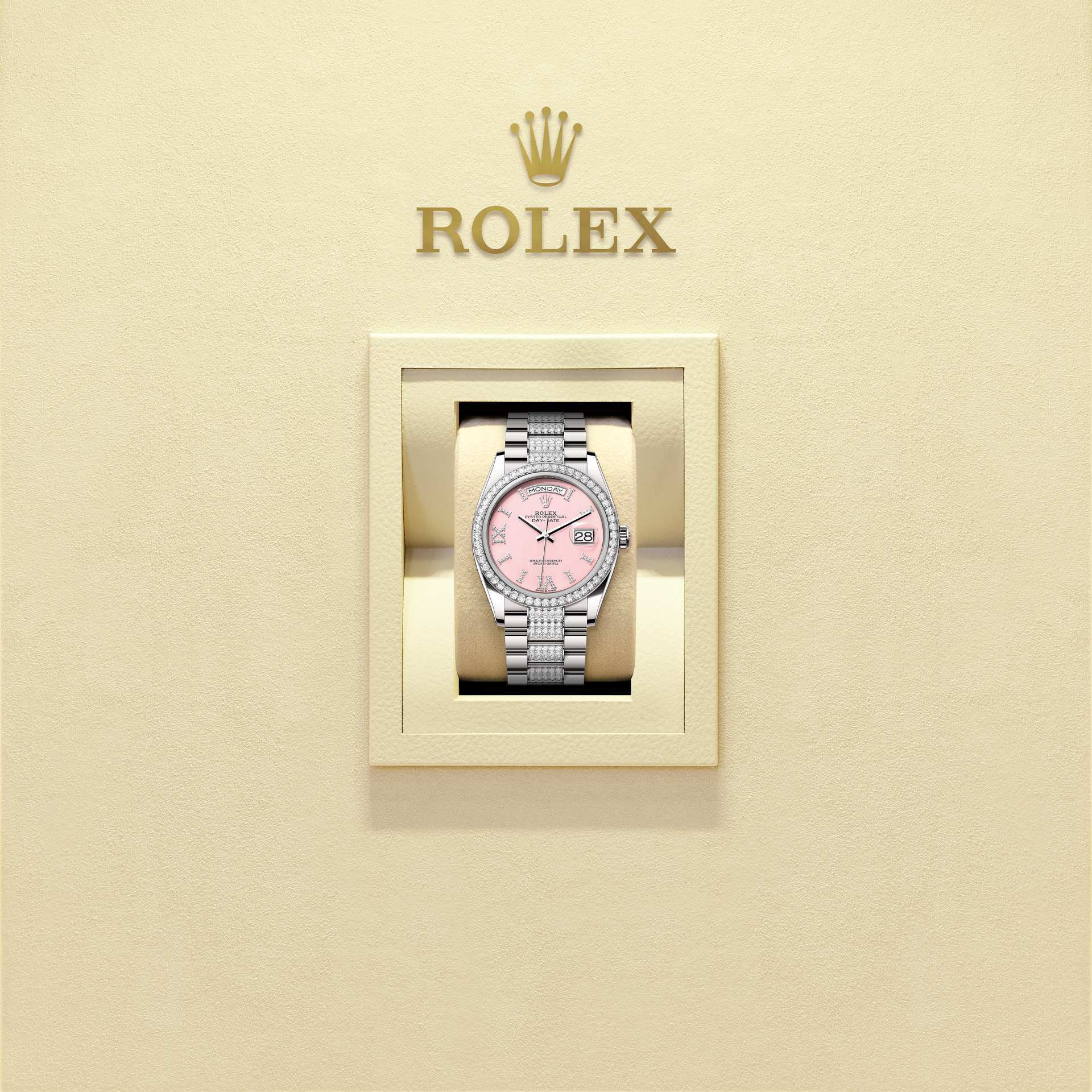 Ce cadran est doté d’index des heures en or 18 ct, sertis de 32 diamants, des chiffres romains VI et IX en or 18 ct, sertis de 24 diamants. Rolex a développé un savoir‑faire particulier dans la création de cadrans en pierre ornementale, comme l’opale rose.