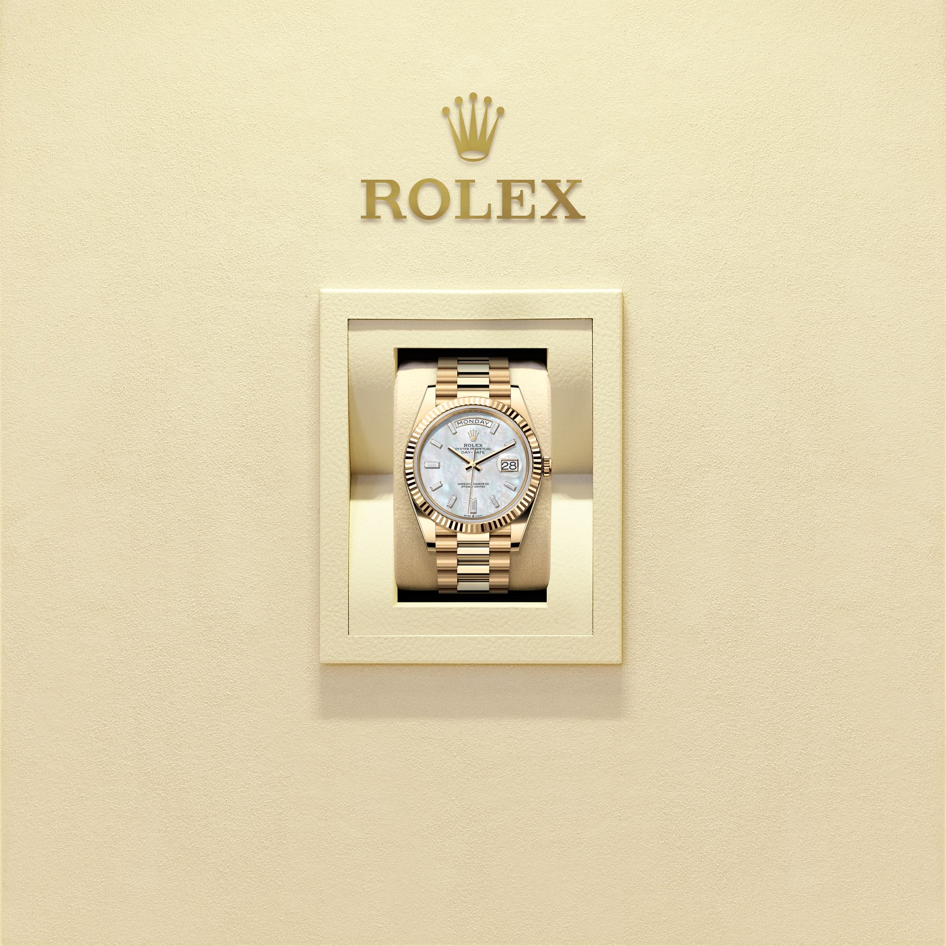 L’Oyster Perpetual Day-Date 40 en or jaune 18 ct dotée d’un cadran en nacre blanche, serti de diamants, d’une lunette cannelée et d’un bracelet President.