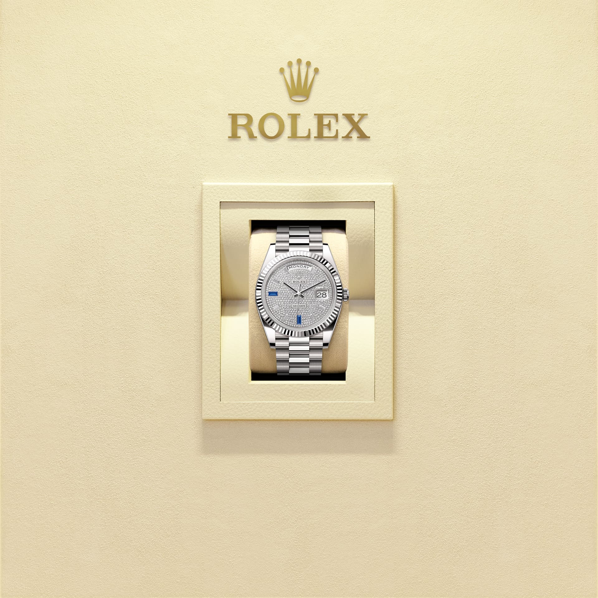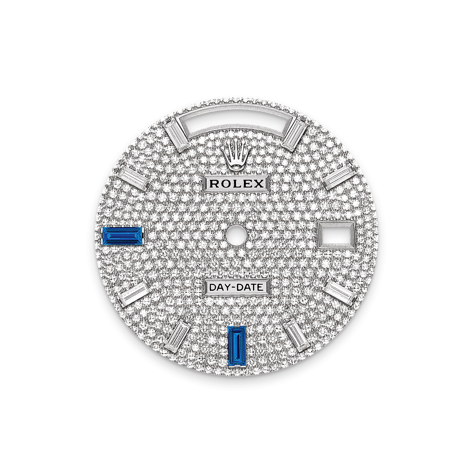 Ce cadran est doté de 8 diamants taille baguette et de 2 saphirs taille baguette à 6 h et 9 h. Diamants, saphirs, rubis et émeraudes ; les pierres les plus nobles et les plus précieuses ornent certaines montres Rolex. La marque dispose en interne des savoir‑faire et des équipements nécessaires pour draper d’un habit de lumière tout modèle de son catalogue.