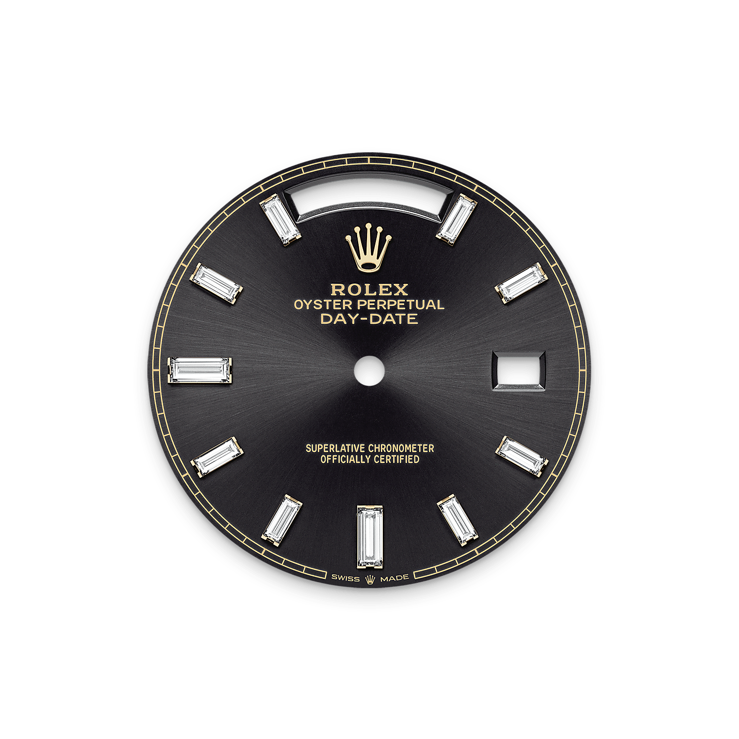 Ce cadran est doté de 10 diamants taille baguette. La finition soleil permet d’obtenir des reflets ondoyants sur de nombreux cadrans de la collection Oyster Perpetual. Créée par un brossage circulaire continu parfaitement maîtrisé, elle présente des stries allant du centre du cadran vers l’extérieur.
