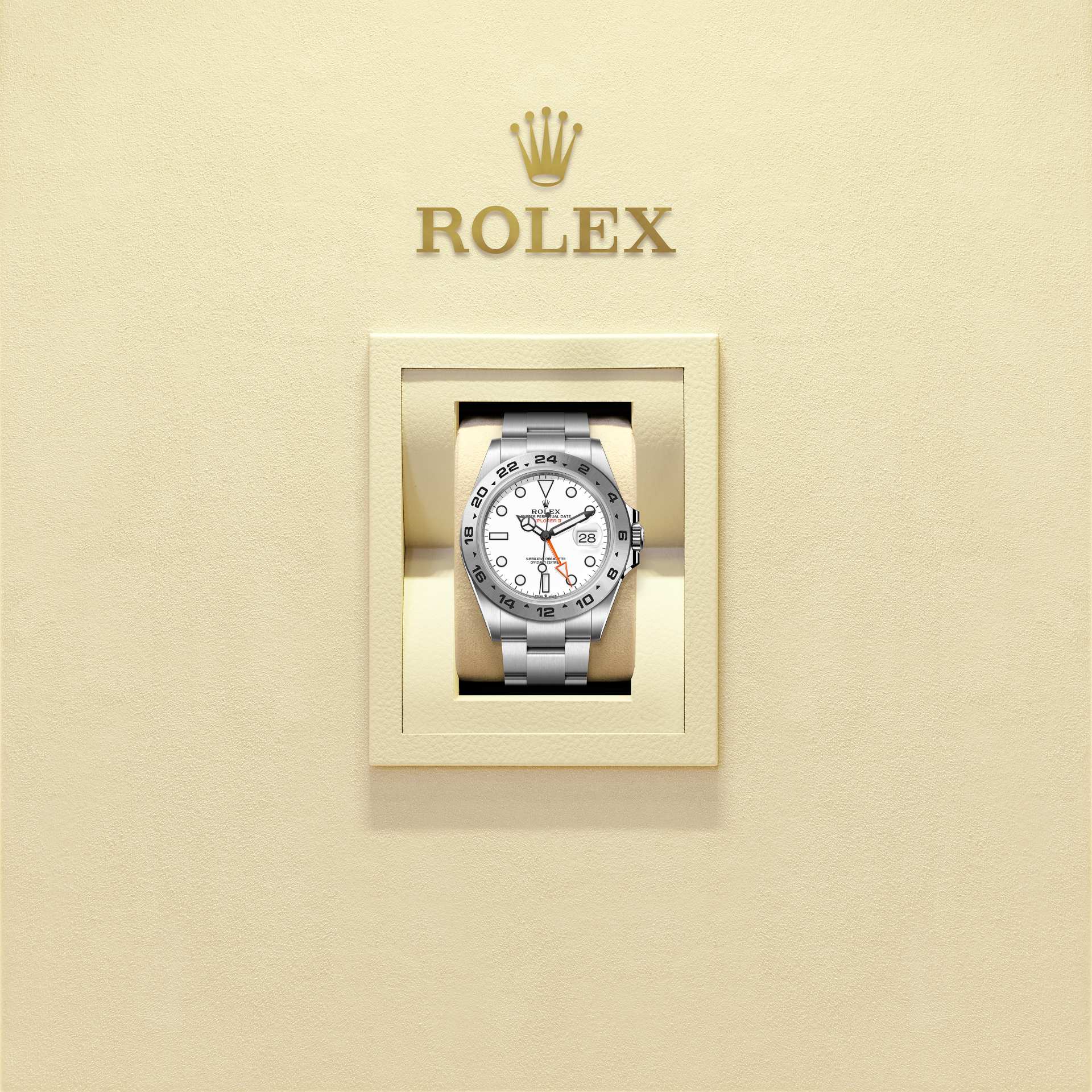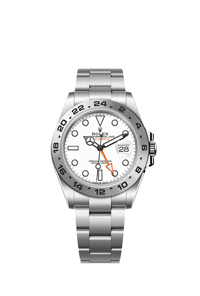 Cette Oyster Perpetual Explorer II en acier Oystersteel est assortie d’un bracelet Oyster et dotée d’un cadran blanc avec une aiguille 24 heures caractéristique en forme de flèche et des index à affichage Chromalight.