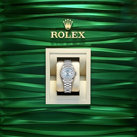 Cette Oyster Perpetual Lady‑Datejust en Platine est dotée d’un cadran bleu glacier serti de diamants et d’un bracelet President.