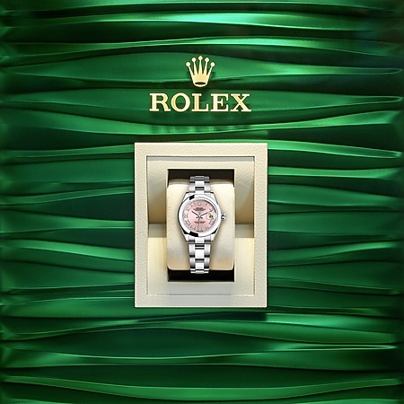 Cette Oyster Perpetual Lady‑Datejust en Acier Oystersteel est dotée d’un cadran rose et d’un bracelet Oyster.