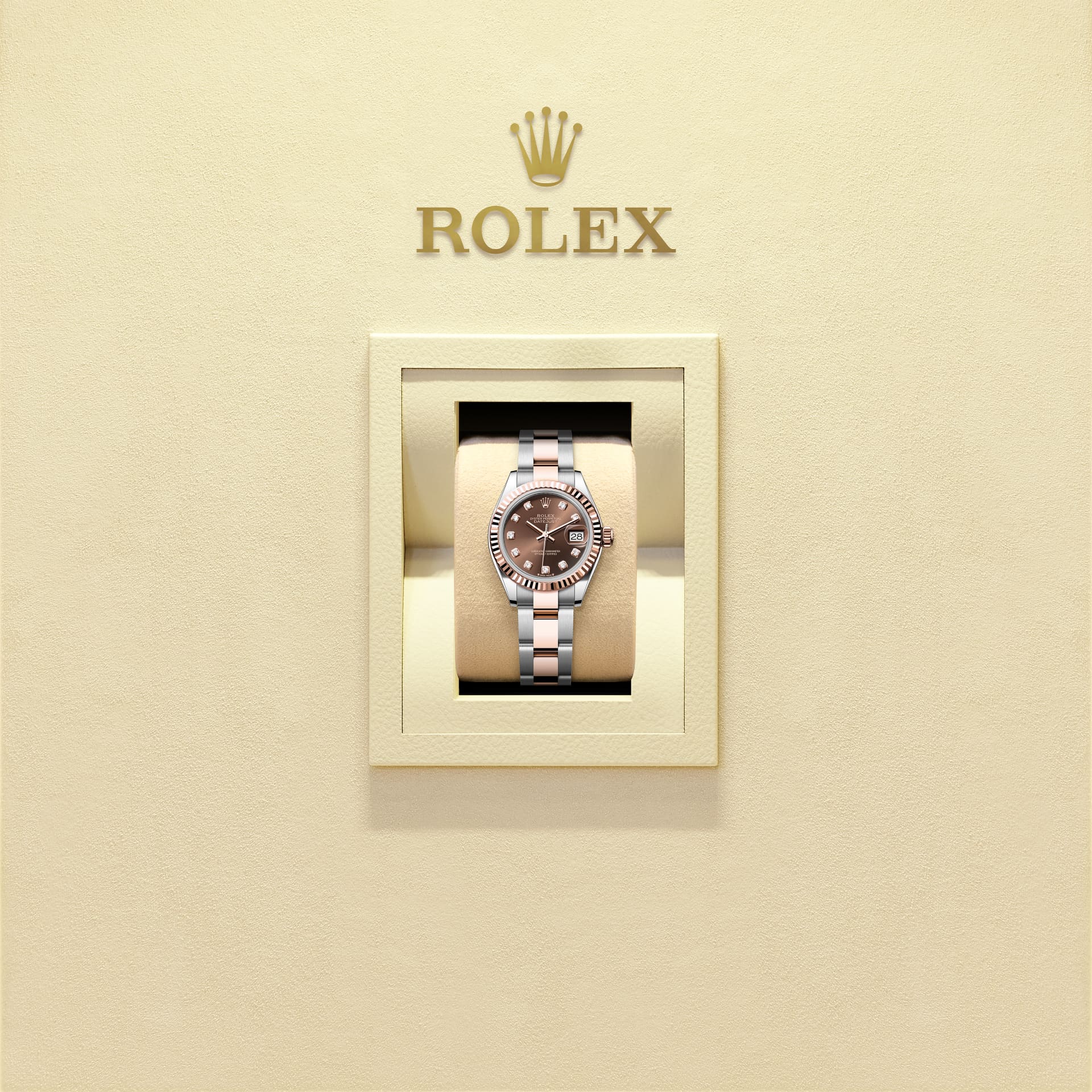 Cette Oyster Perpetual Lady-Datejust en acier Oystersteel et or Everose est dotée d’un cadran chocolat, serti de diamants et d’un bracelet Oyster.