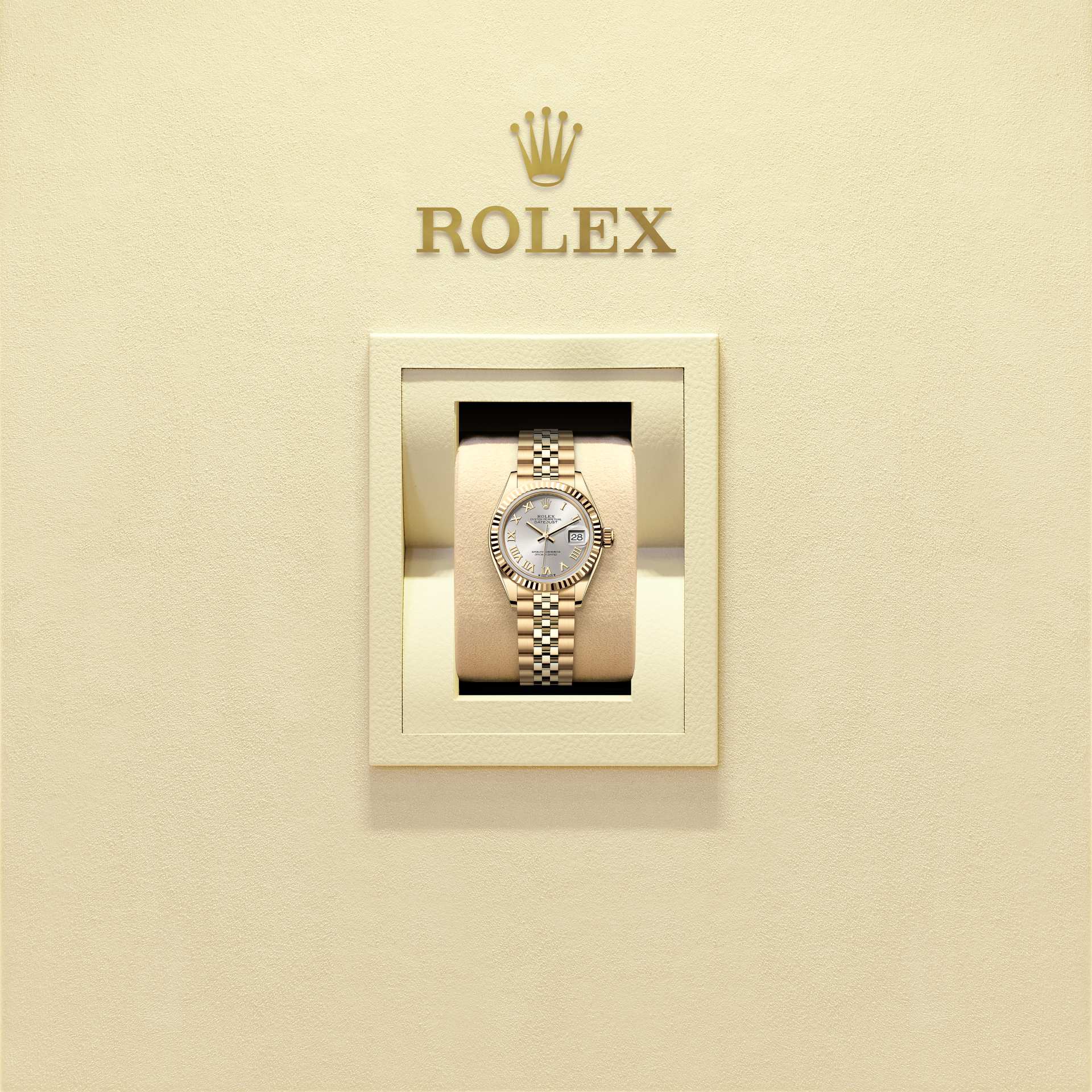 De plus, elles étaient identiques aux cannelures présentes sur le fond de boîtier, lui aussi vissé sur le boîtier pour la même raison, au moyen d’outils Rolex spécifiques. Avec le temps, les cannelures sont devenues un élément purement esthétique, la signature de Rolex. Aujourd'hui la lunette cannelée est un élément signature, en or sur cette Lady-Datejust.