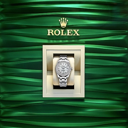 L’Oyster Perpetual Pearlmaster 34 en Or gris 18 ct est assortie d’un cadran en nacre blanche serti de diamants et dotée d’une lunette sertie de diamants et du bracelet Pearlmaster signature.