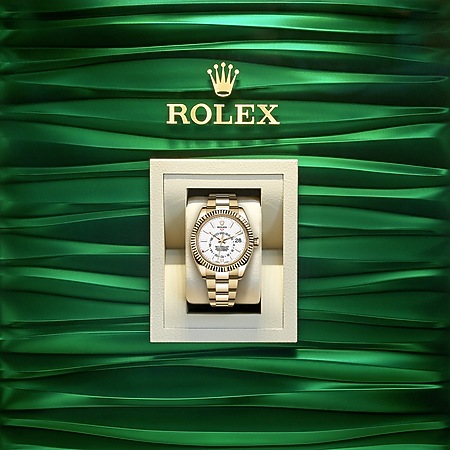 L’Oyster Perpetual Sky‑Dweller en Or jaune 18 ct est dotée d’un cadran blanc et d’un bracelet Oyster.