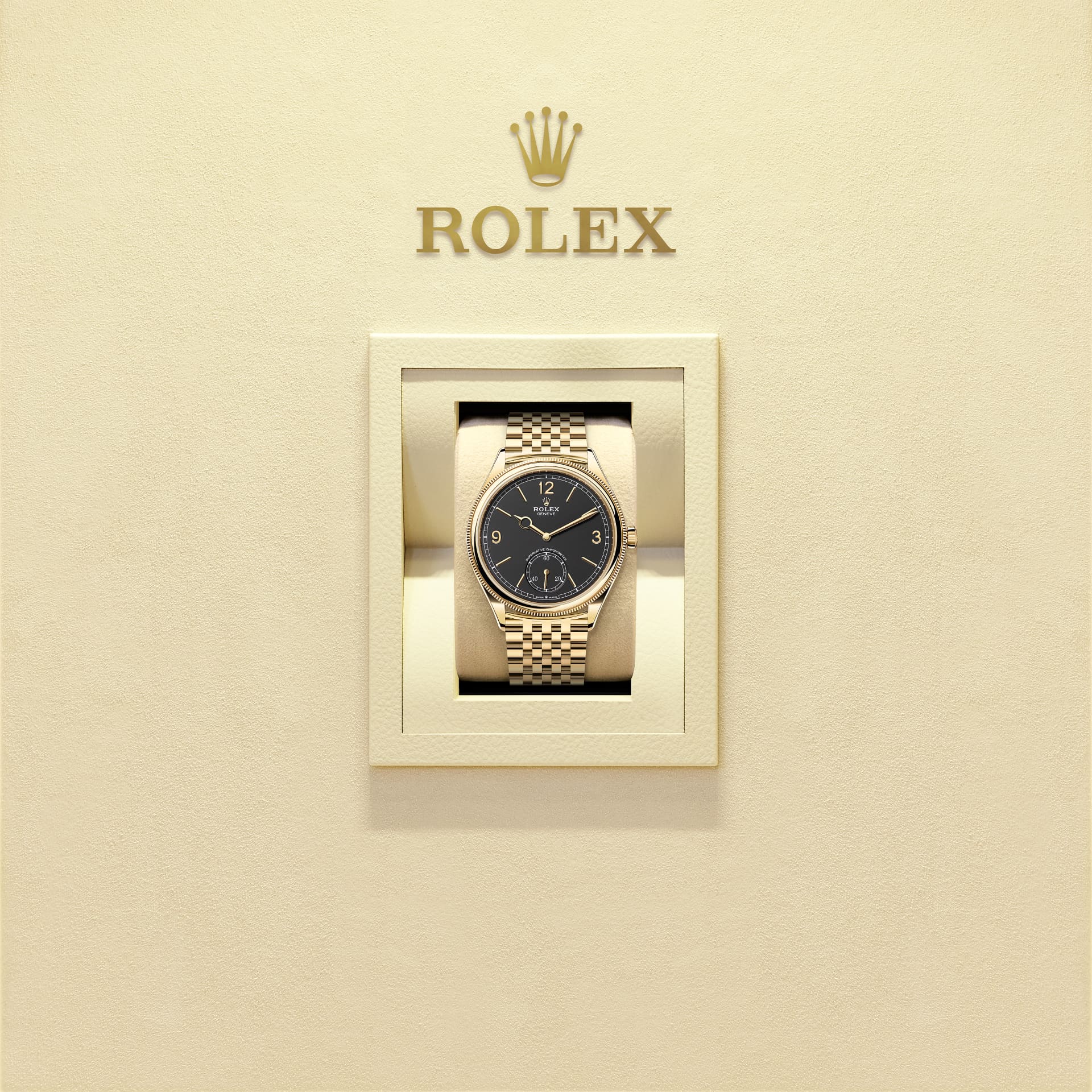 הפרפטואל 1908 מזהב צהוב 18 קראט מצויד בבית שעון בקוטר 39 מ"מ, לוח מחוגים בצבע שחור עמוק וצמיד Settimo.