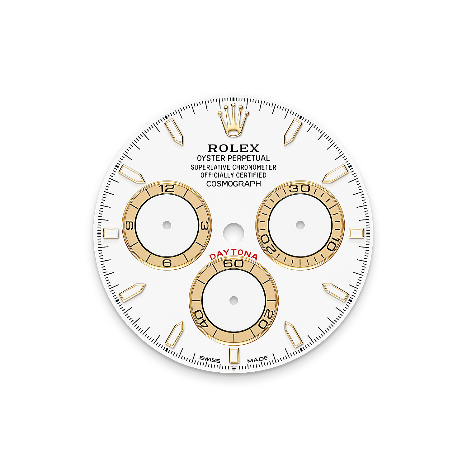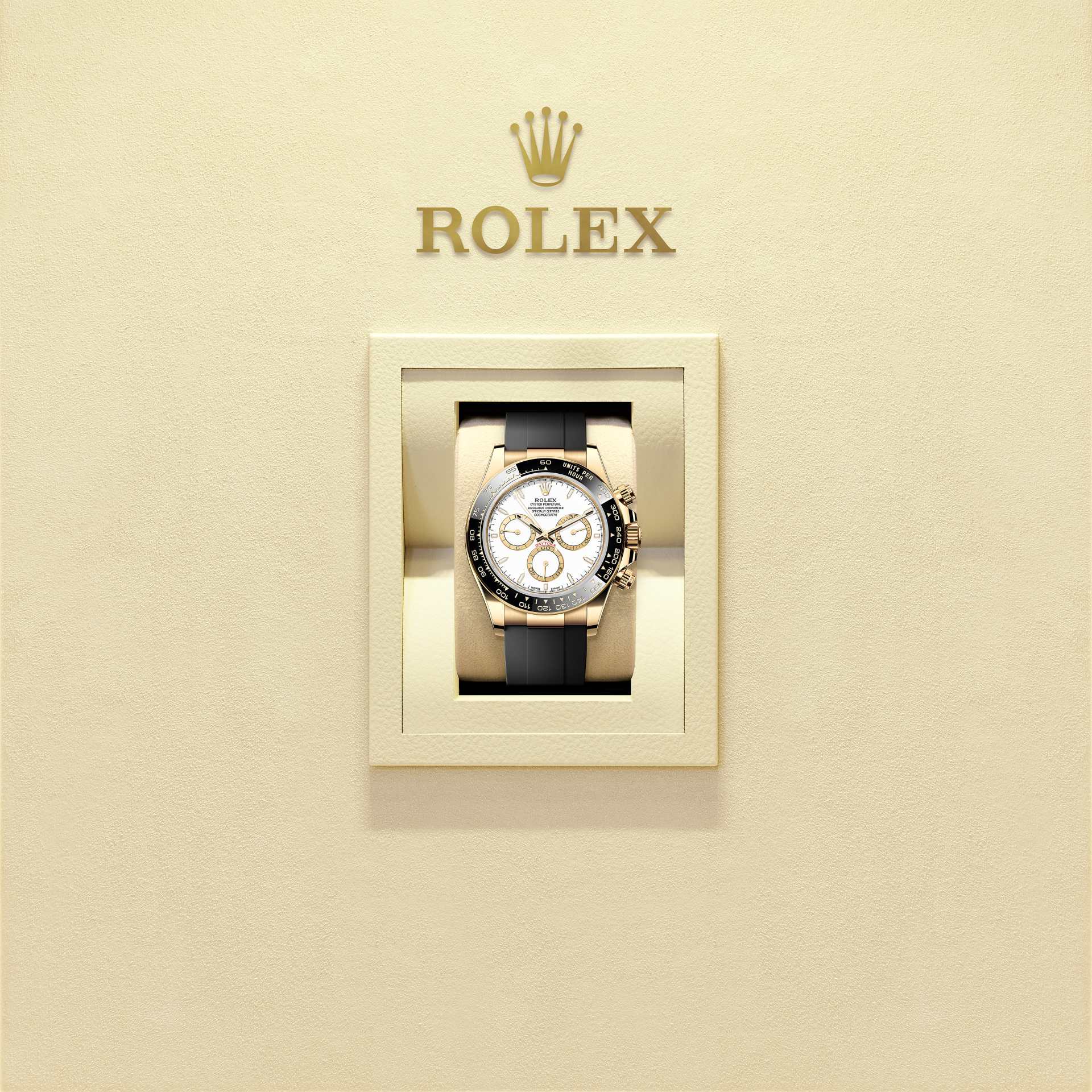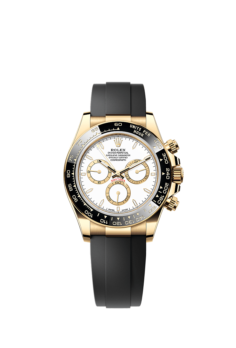 האויסטר פרפטואל קוסמוגרף דייטונה מזהב צהוב 18 קראט עם לוח מחוגים בצבע לבן, וטבעות מונים בצבעים ניגודיים. הוא מצויד בצמיד אויסטרפלקס ומסגרת Cerachrom שחור עם שנתות למדידת מהירות.