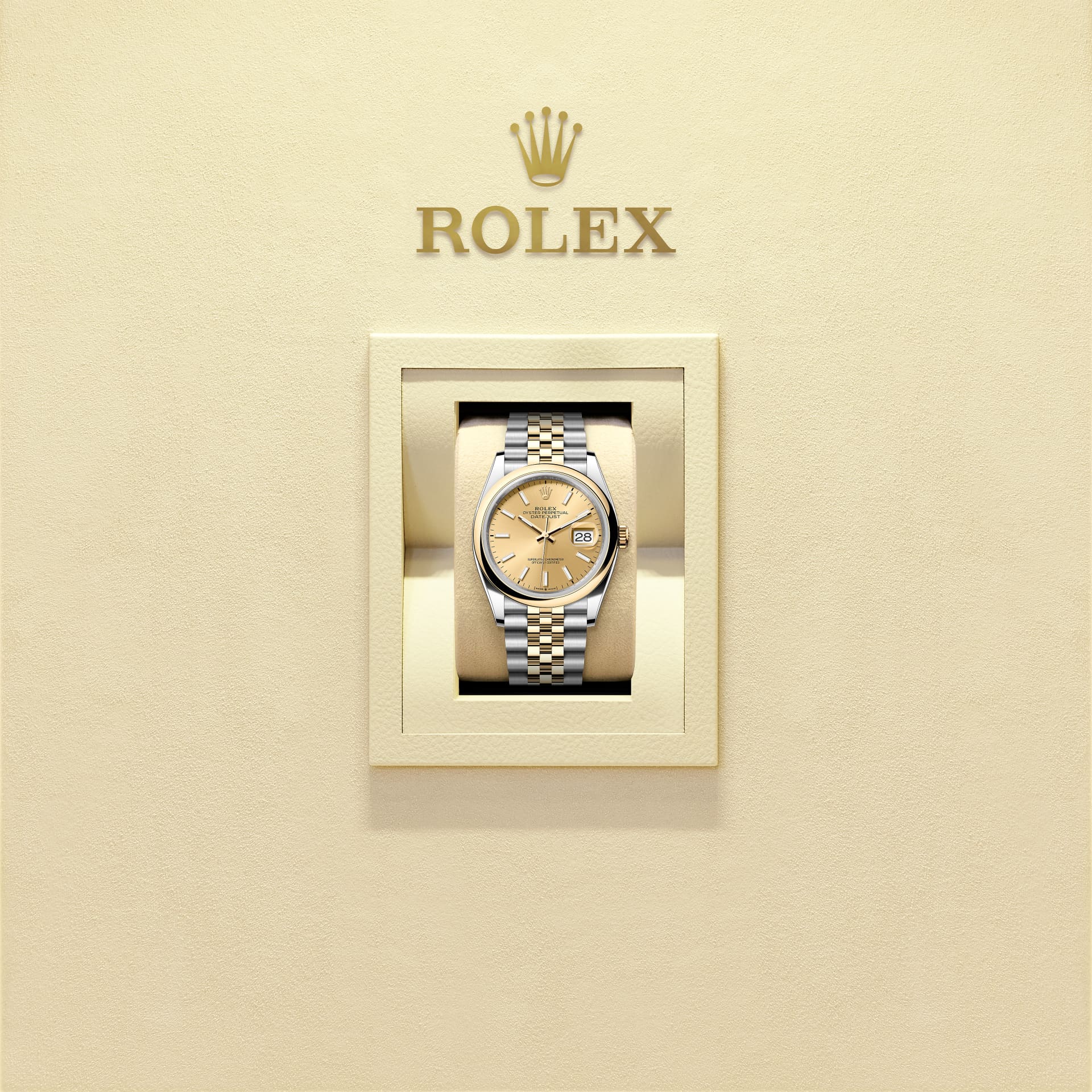 אויסטר פרפטואל דייטג'אסט 36 זה מפלדת אויסטר וזהב צהוב מצויד בלוח מחוגים בצבע שמפניה וצמיד ג'ובילי (Jubilee).