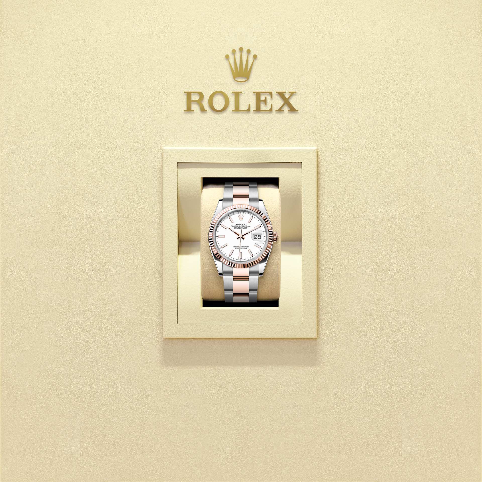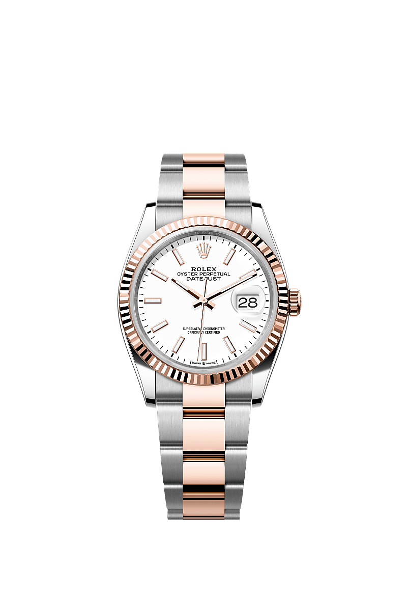 אויסטר פרפטואל דייטג'אסט 36 זה מפלדת אויסטר וזהב אוורוז מצויד בלוח מחוגים לבן וצמיד אויסטר.
