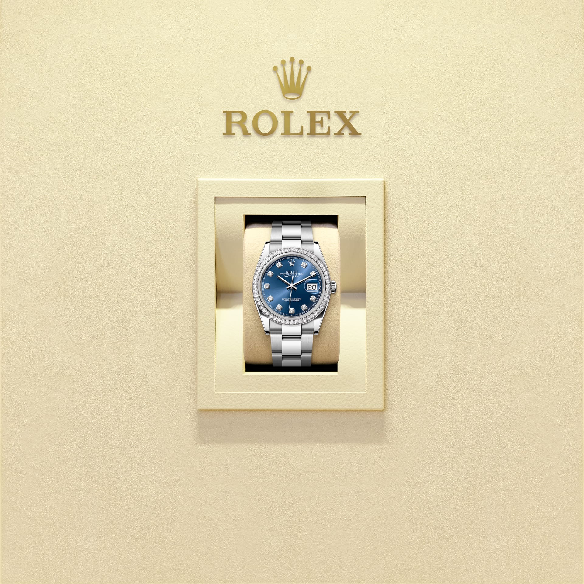 אויסטר פרפטואל דייטג'אסט 36 זה מפלדת אויסטר וזהב לבן מצויד בלוח מחוגים בצבע כחול בהיר, בשיבוץ יהלומים וצמיד אויסטר.