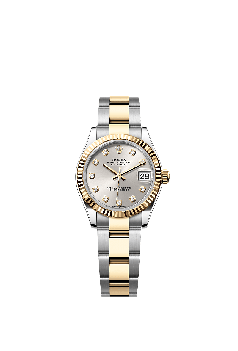 אויסטר פרפטואל דייטג'אסט 31 זה מפלדת אויסטר וזהב צהוב מצויד בלוח מחוגים מכסף, בשיבוץ יהלומים וצמיד אויסטר.